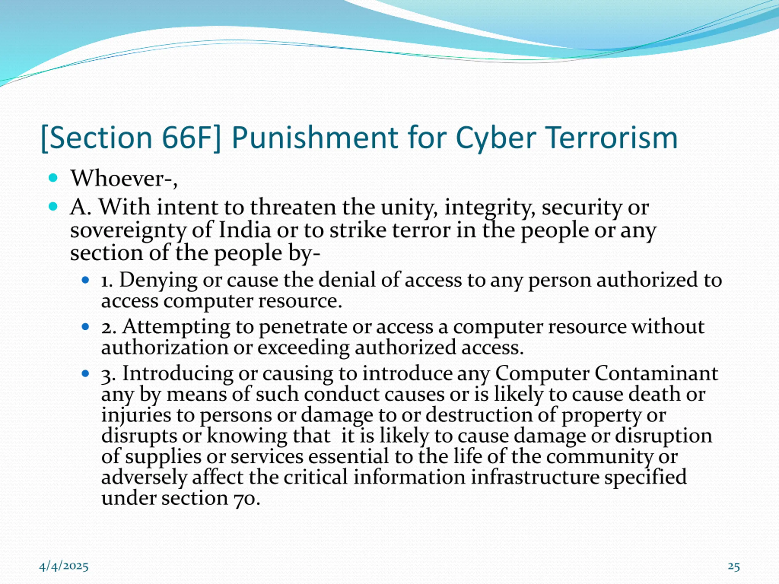 [Section 66F] Punishment for Cyber Terrorism Whoever-, A. With intent to threaten the unity, integrity, security or sovereignty of India or to strike terror in the people or any section of the people by- 1. Denying or cause the denial of access to any person authorized to access computer resource. 2. Attempting to penetrate or access a computer resource without authorization or exceeding authorized access. 3. Introducing or causing to introduce any Computer Contaminant any by means of such conduct causes or is likely to cause death or injuries to persons or damage to or destruction of property or disrupts or knowing that it is likely to cause damage or disruption of supplies or services essential to the life of the community or adversely affect the critical information infrastructure specified under section 70. 4/4/2025 25
