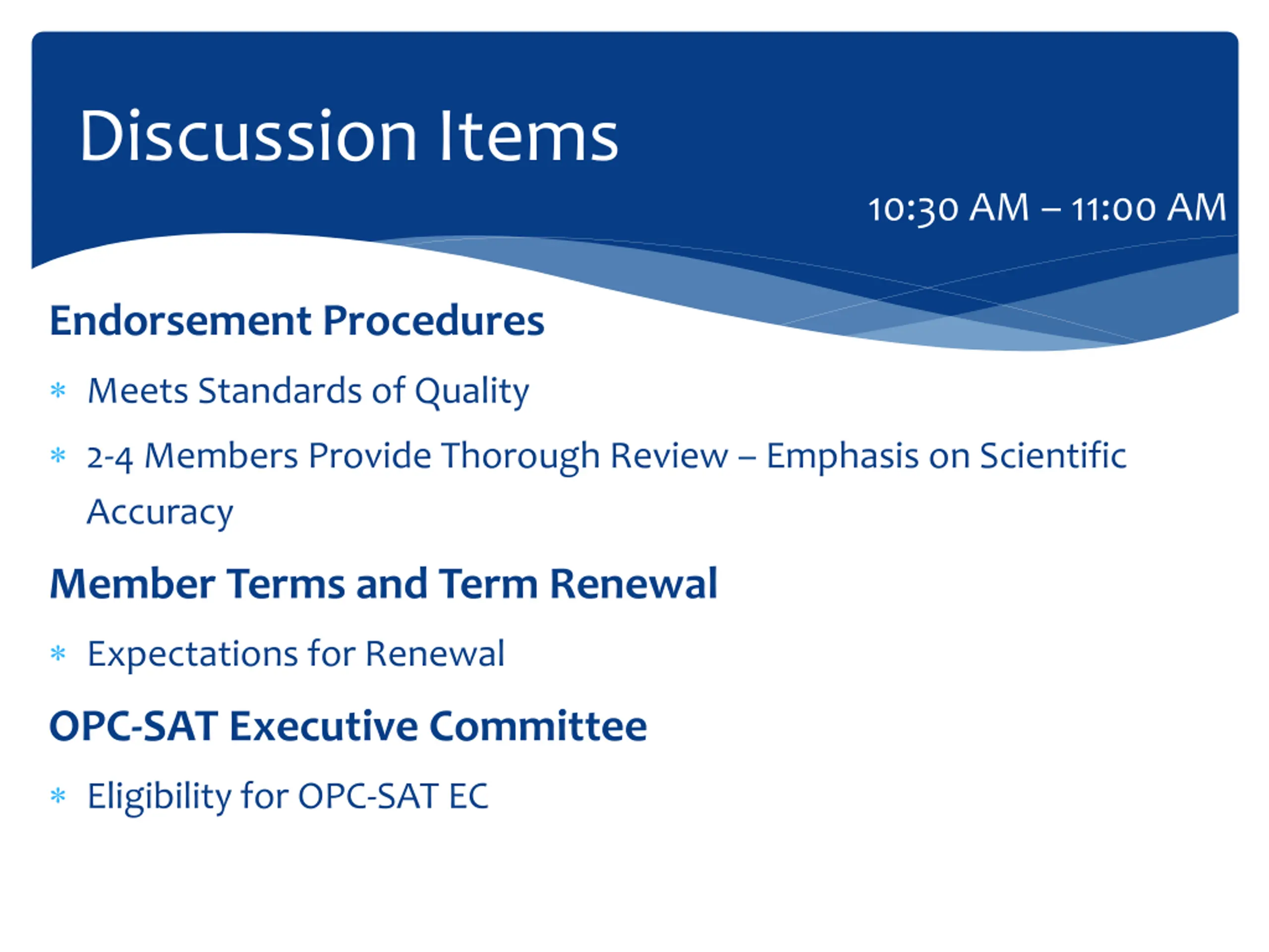 Discussion Items 10:30 AM 11:00 AM Endorsement Procedures Meets Standards of Quality 2-4 Members Provide Thorough Review Emphasis on Scientific Accuracy Member Terms and Term Renewal Expectations for Renewal OPC-SAT Executive Committee Eligibility for OPC-SAT EC