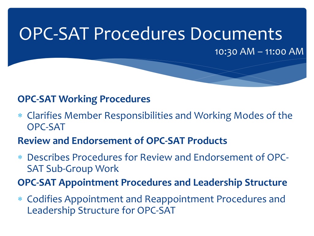OPC-SAT Procedures Documents 10:30 AM 11:00 AM OPC-SAT Working Procedures Clarifies Member Responsibilities and Working Modes of the OPC-SAT Review and Endorsement of OPC-SAT Products Describes Procedures for Review and Endorsement of OPC- SAT Sub-Group Work OPC-SAT Appointment Procedures and Leadership Structure Codifies Appointment and Reappointment Procedures and Leadership Structure for OPC-SAT