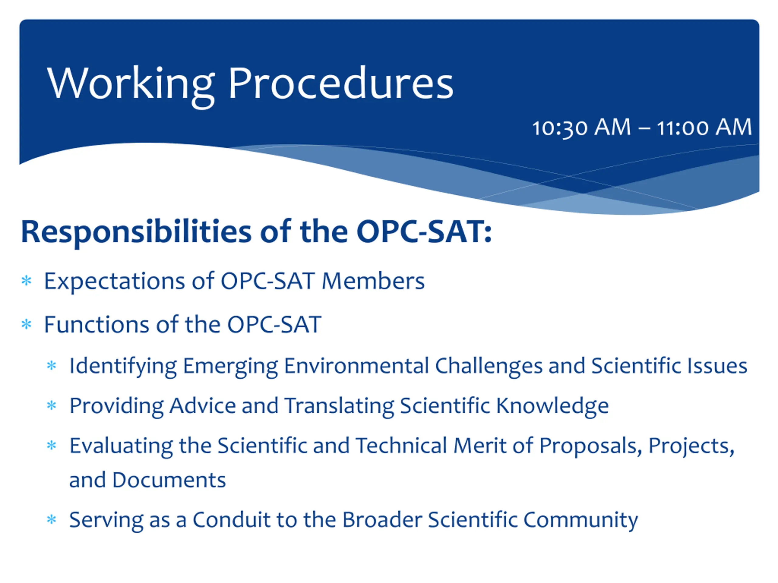 Working Procedures 10:30 AM 11:00 AM Responsibilities of the OPC-SAT: Expectations of OPC-SAT Members Functions of the OPC-SAT Identifying Emerging Environmental Challenges and Scientific Issues Providing Advice and Translating Scientific Knowledge Evaluating the Scientific and Technical Merit of Proposals, Projects, and Documents Serving as a Conduit to the Broader Scientific Community