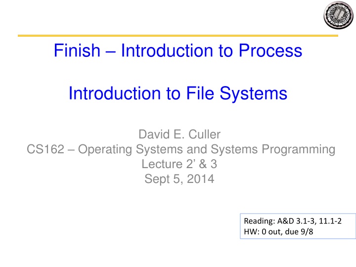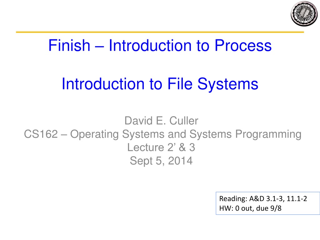 Finish Introduction to Process Introduction to File Systems David E. Culler CS162 Operating Systems and Systems Programming Lecture 2 & 3 Sept 5, 2014 Reading: A&D 3.1-3, 11.1-2 HW: 0 out, due 9/8