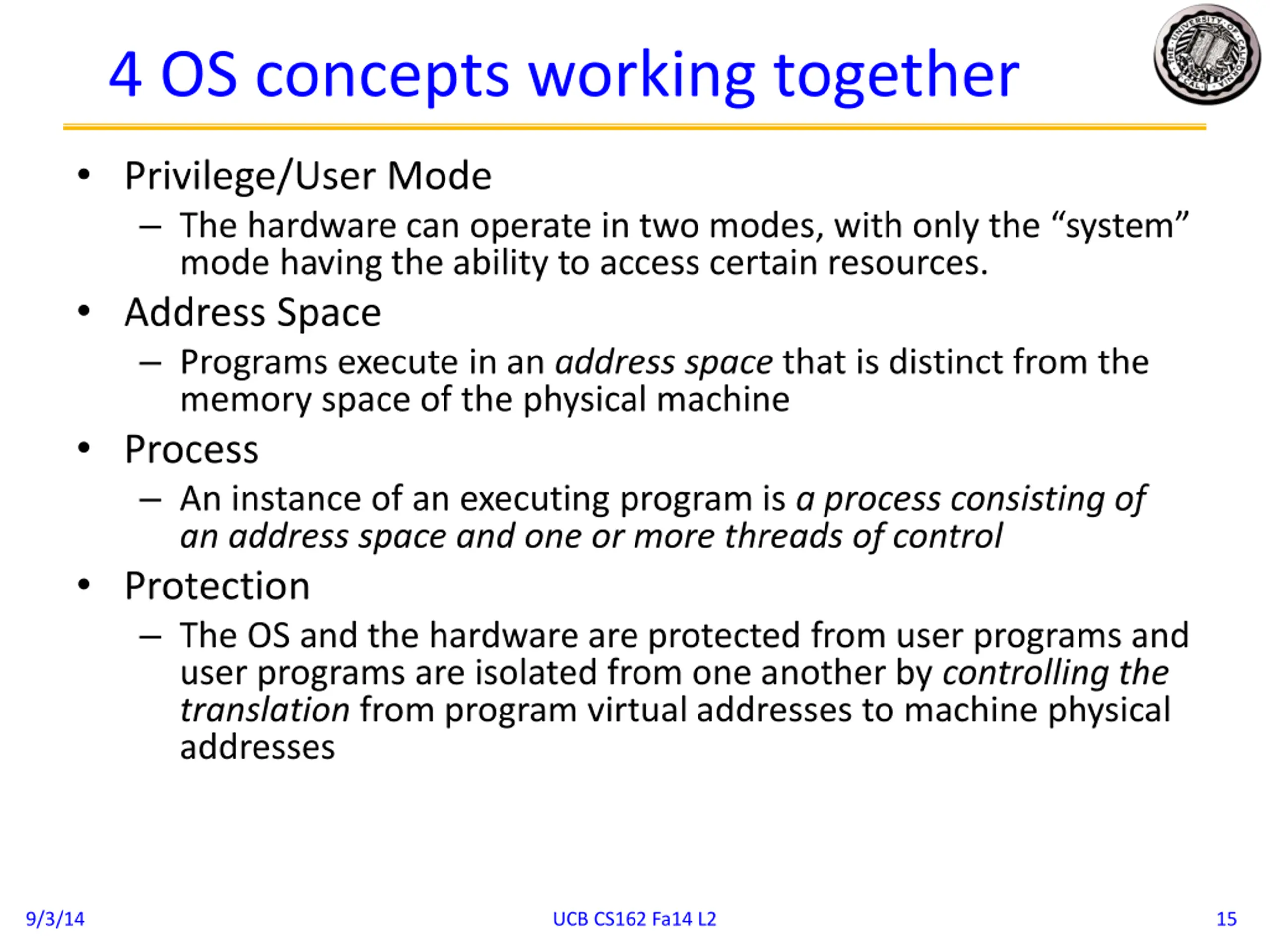4 OS concepts working together Privilege/User Mode The hardware can operate in two modes, with only the system mode having the ability to access certain resources. Address Space Programs execute in an address space that is distinct from the memory space of the physical machine Process An instance of an executing program is a process consisting of an address space and one or more threads of control Protection The OS and the hardware are protected from user programs and user programs are isolated from one another by controlling the translation from program virtual addresses to machine physical addresses 9/3/14 UCB CS162 Fa14 L2 15