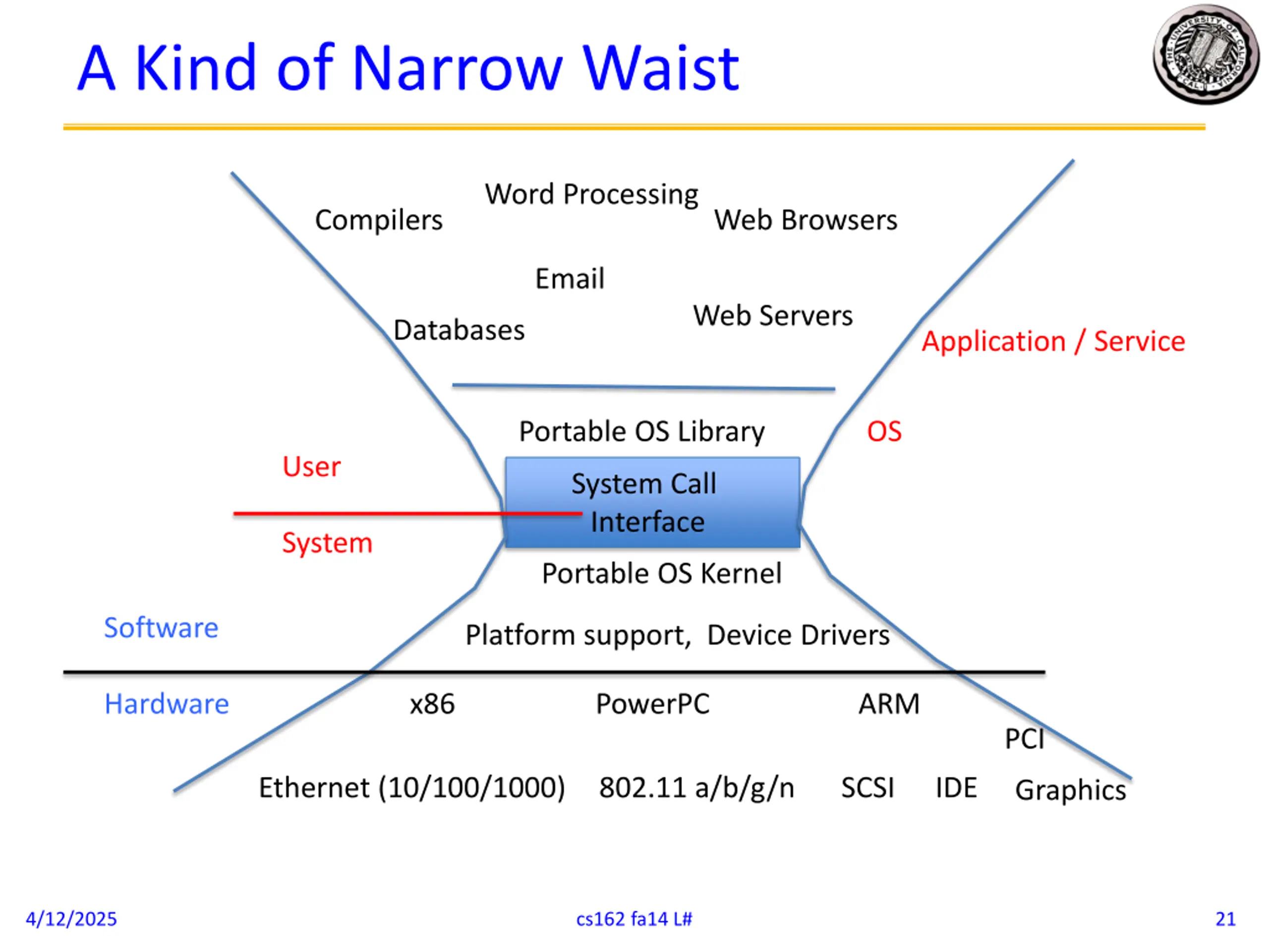 A Kind of Narrow Waist Word Processing Compilers Web Browsers Email Web Servers Databases Application / Service OS Portable OS Library User System Call Interface System Portable OS Kernel Software Platform support, Device Drivers Hardware x86 PowerPC ARM PCI Ethernet (10/100/1000) 802.11 a/b/g/n SCSI IDE Graphics 4/12/2025 cs162 fa14 L# 21