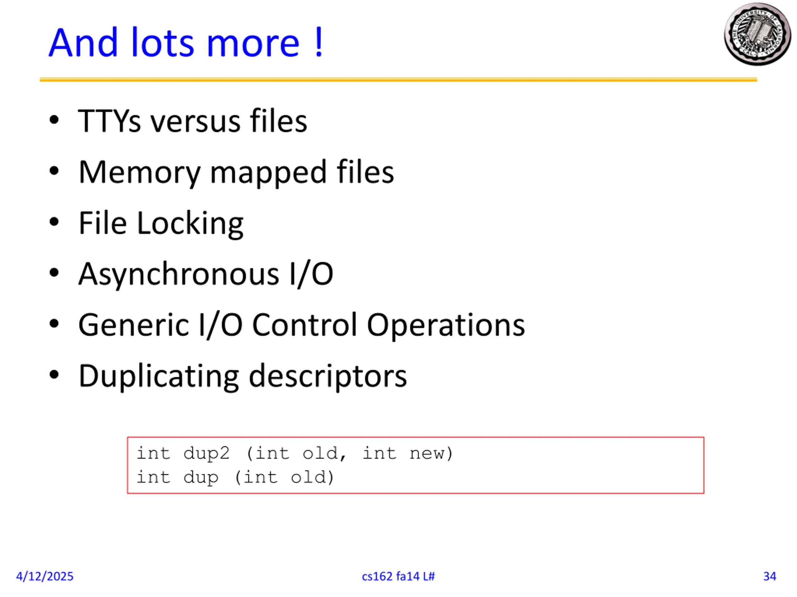 And lots more ! TTYs versus files Memory mapped files File Locking Asynchronous I/O Generic I/O Control Operations Duplicating descriptors int dup2 (int old, int new) int dup (int old) 4/12/2025 cs162 fa14 L# 34