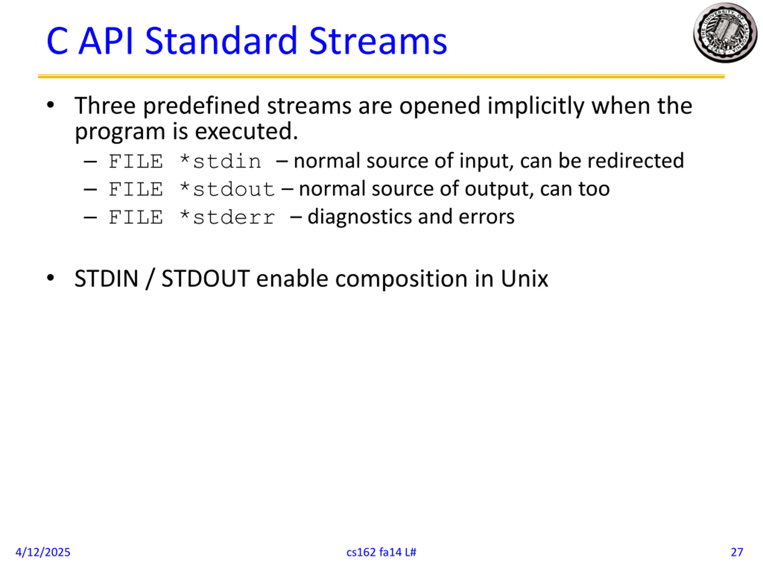 C API Standard Streams Three predefined streams are opened implicitly when the program is executed. FILE *stdin normal source of input, can be redirected FILE *stdout normal source of output, can too FILE *stderr diagnostics and errors STDIN / STDOUT enable composition in Unix 4/12/2025 cs162 fa14 L# 27