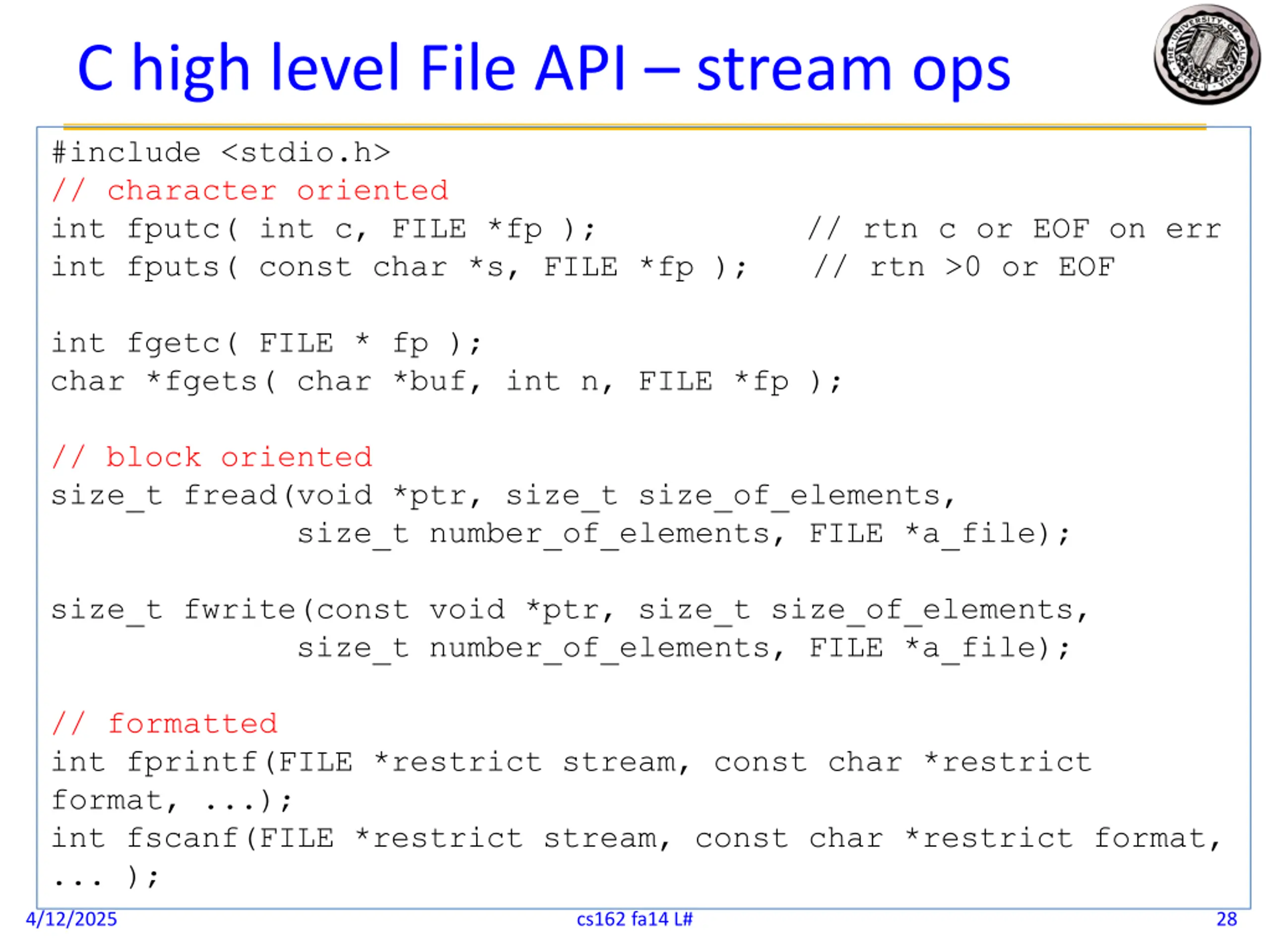 C high level File API stream ops #include <stdio.h> // character oriented int fputc( int c, FILE *fp ); int fputs( const char *s, FILE *fp ); // rtn c or EOF on err // rtn >0 or EOF int fgetc( FILE * fp ); char *fgets( char *buf, int n, FILE *fp ); // block oriented size_t fread(void *ptr, size_t size_of_elements, size_t number_of_elements, FILE *a_file); size_t fwrite(const void *ptr, size_t size_of_elements, size_t number_of_elements, FILE *a_file); // formatted int fprintf(FILE *restrict stream, const char *restrict format, ...); int fscanf(FILE *restrict stream, const char *restrict format, ... ); 4/12/2025 cs162 fa14 L# 28