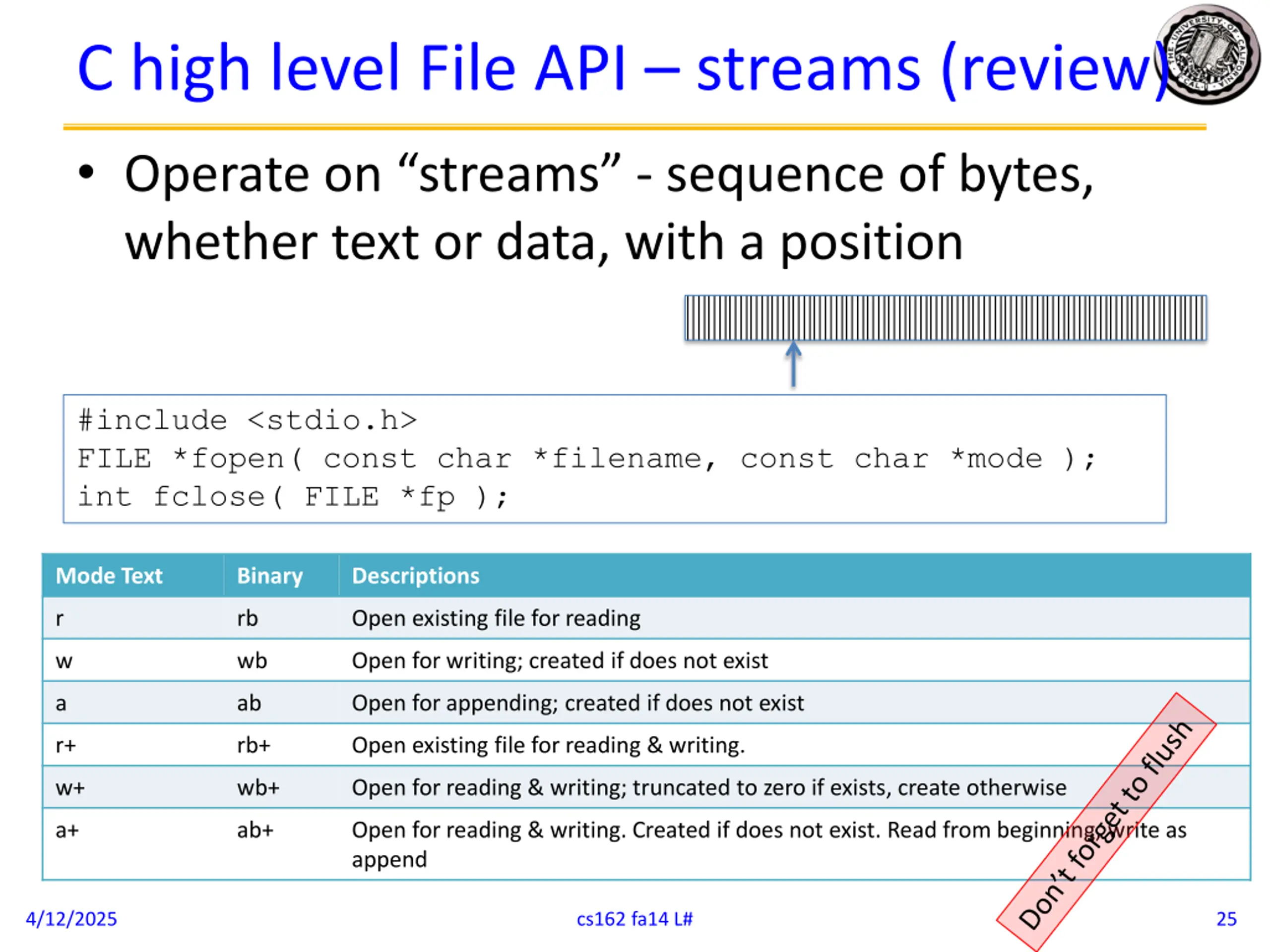 C high level File API streams (review) Operate on streams - sequence of bytes, whether text or data, with a position #include <stdio.h> FILE *fopen( const char *filename, const char *mode ); int fclose( FILE *fp ); Mode Text Binary Descriptions r rb Open existing file for reading w wb Open for writing; created if does not exist a ab Open for appending; created if does not exist r+ rb+ Open existing file for reading & writing. w+ wb+ Open for reading & writing; truncated to zero if exists, create otherwise a+ ab+ Open for reading & writing. Created if does not exist. Read from beginning, write as append 4/12/2025 cs162 fa14 L# 25