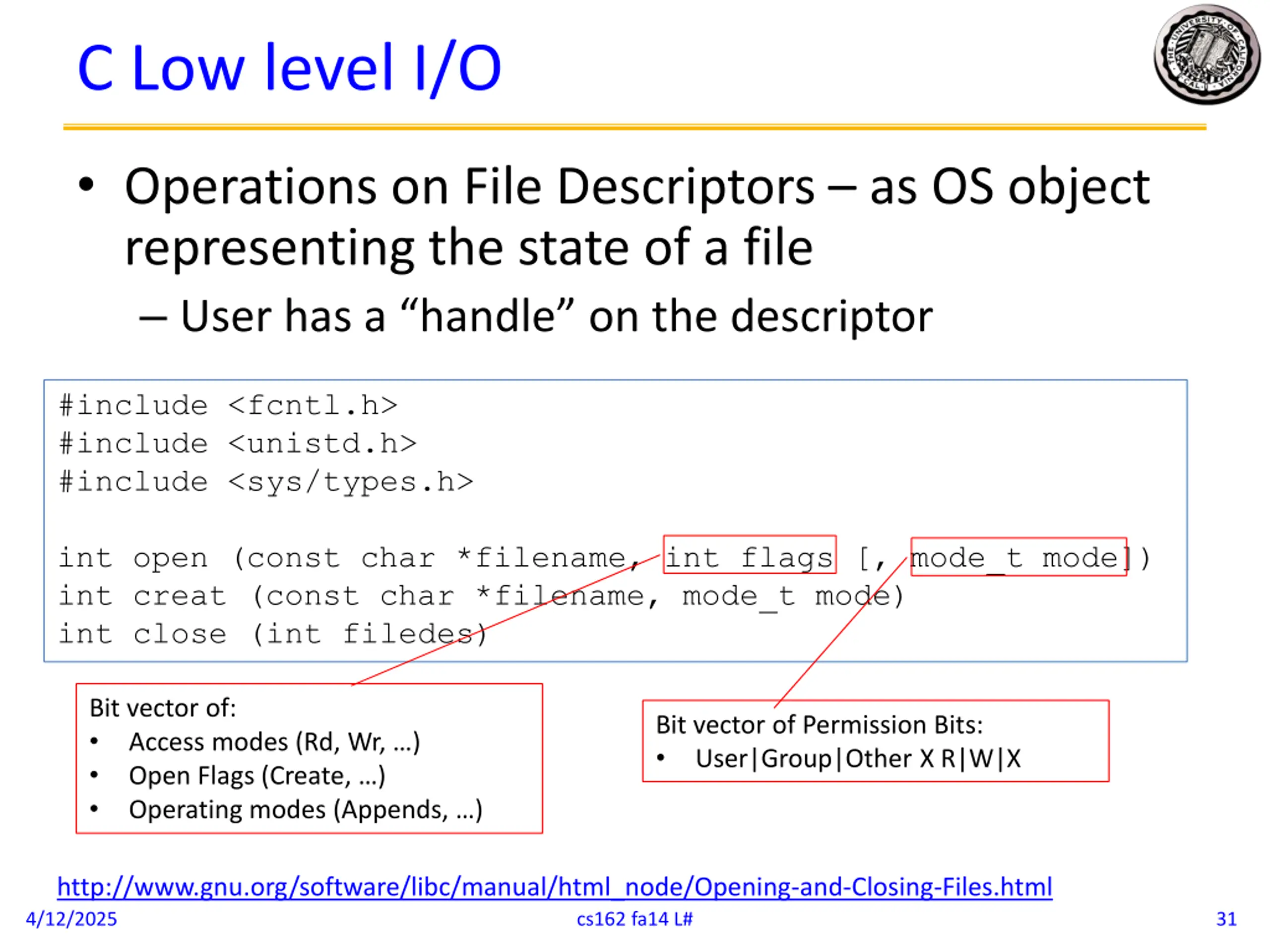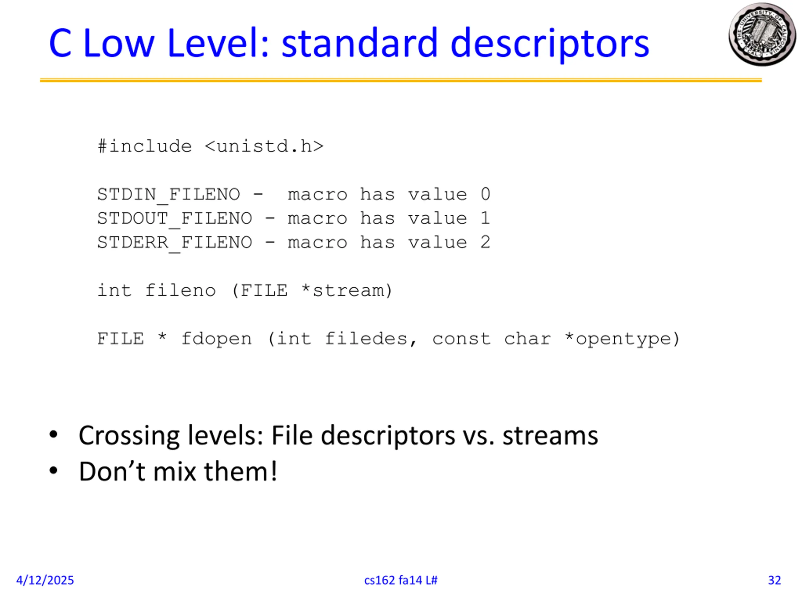 C Low Level: standard descriptors #include <unistd.h> STDIN_FILENO - macro has value 0 STDOUT_FILENO - macro has value 1 STDERR_FILENO - macro has value 2 int fileno (FILE *stream) FILE * fdopen (int filedes, const char *opentype) Crossing levels: File descriptors vs. streams Don t mix them! 4/12/2025 cs162 fa14 L# 32