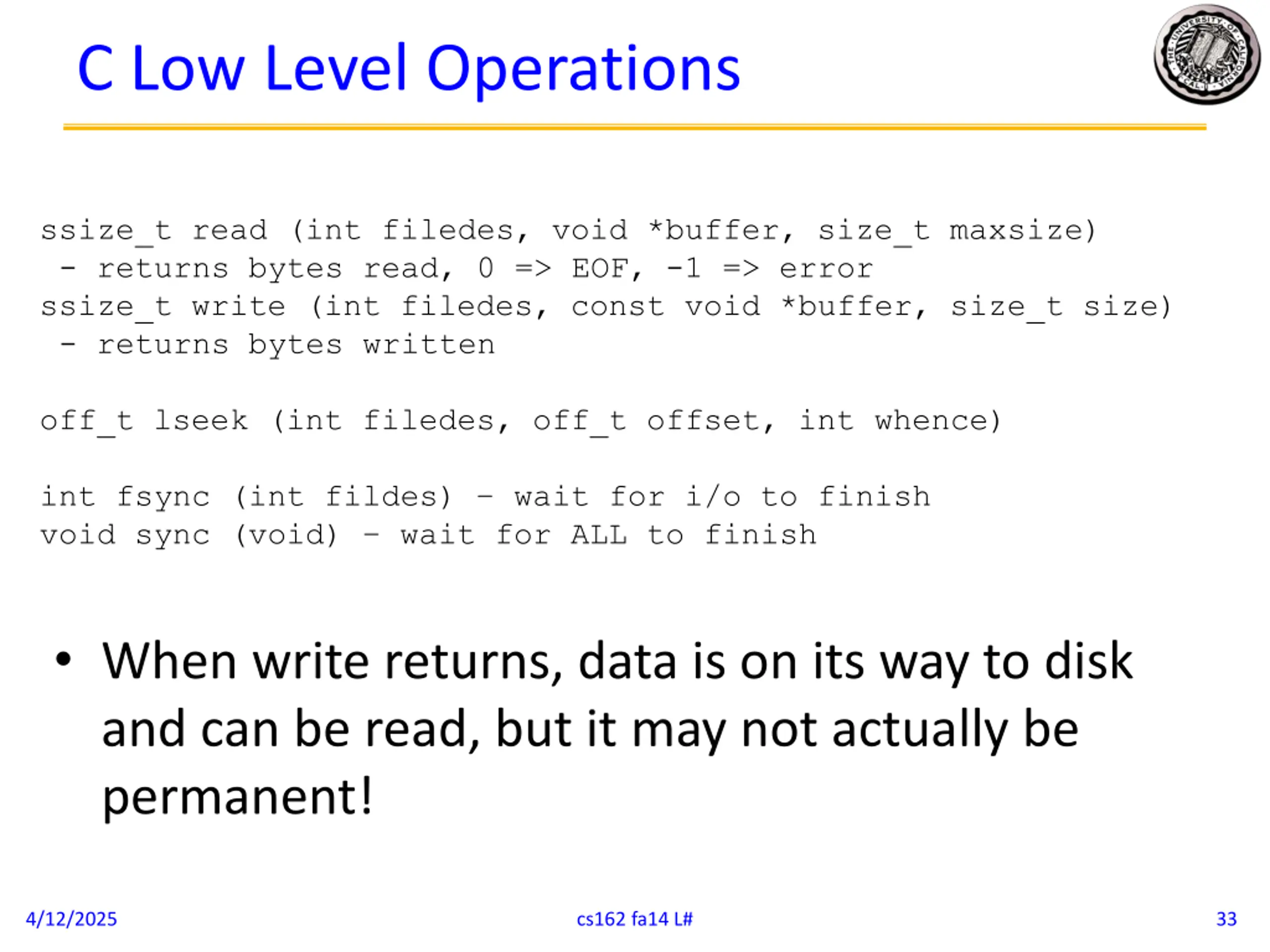 C Low Level Operations ssize_t read (int filedes, void *buffer, size_t maxsize) - returns bytes read, 0 => EOF, -1 => error ssize_t write (int filedes, const void *buffer, size_t size) - returns bytes written off_t lseek (int filedes, off_t offset, int whence) int fsync (int fildes) wait for i/o to finish void sync (void) wait for ALL to finish When write returns, data is on its way to disk and can be read, but it may not actually be permanent! 4/12/2025 cs162 fa14 L# 33
