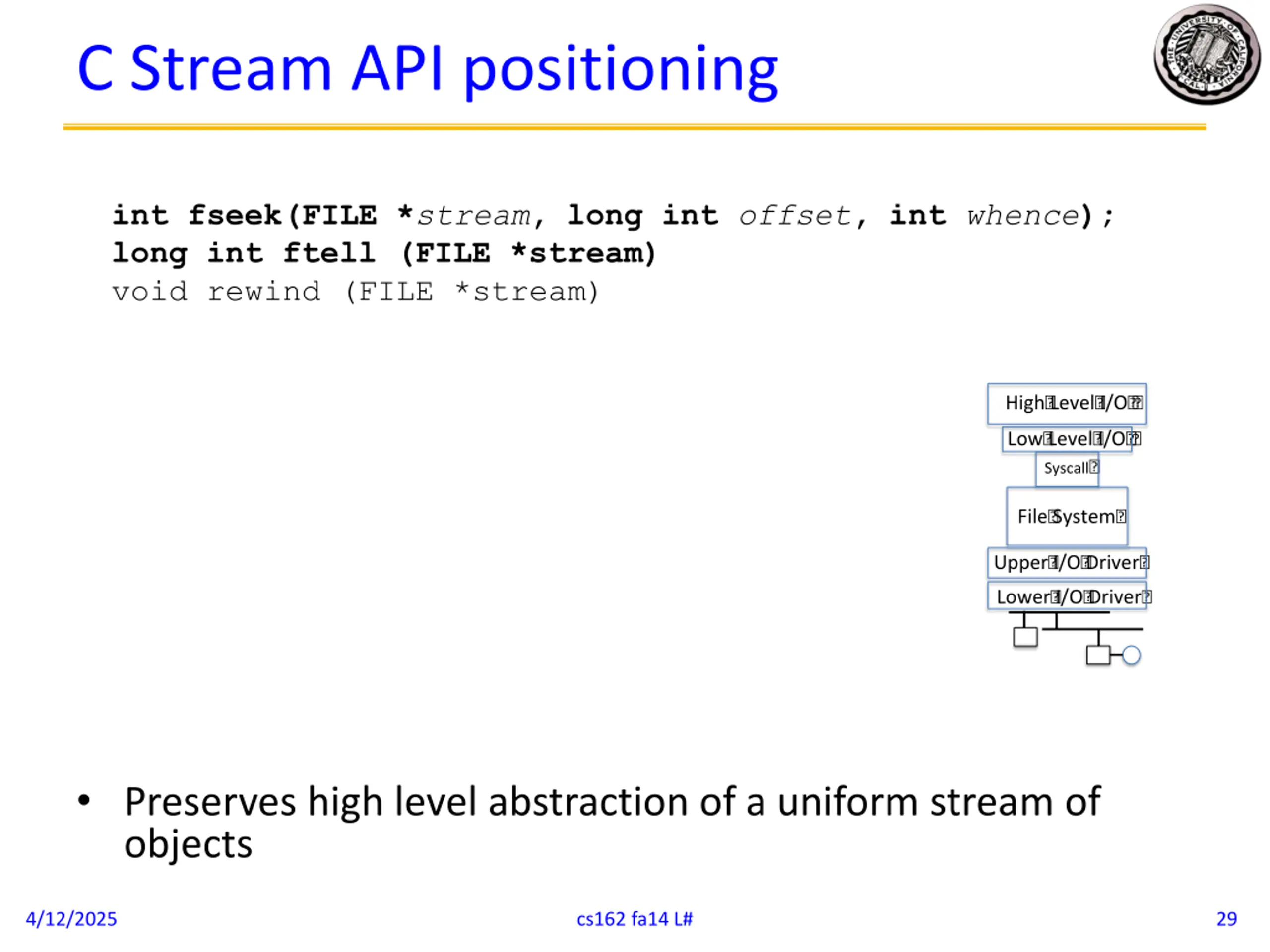 C Stream API positioning int fseek(FILE *stream, long int offset, int whence); long int ftell (FILE *stream) void rewind (FILE *stream) High? Level? I/O? ? Low? Level? I/O? ? Syscall? File? System? Upper? I/O? Driver? Lower? I/O? Driver? Preserves high level abstraction of a uniform stream of objects 4/12/2025 cs162 fa14 L# 29