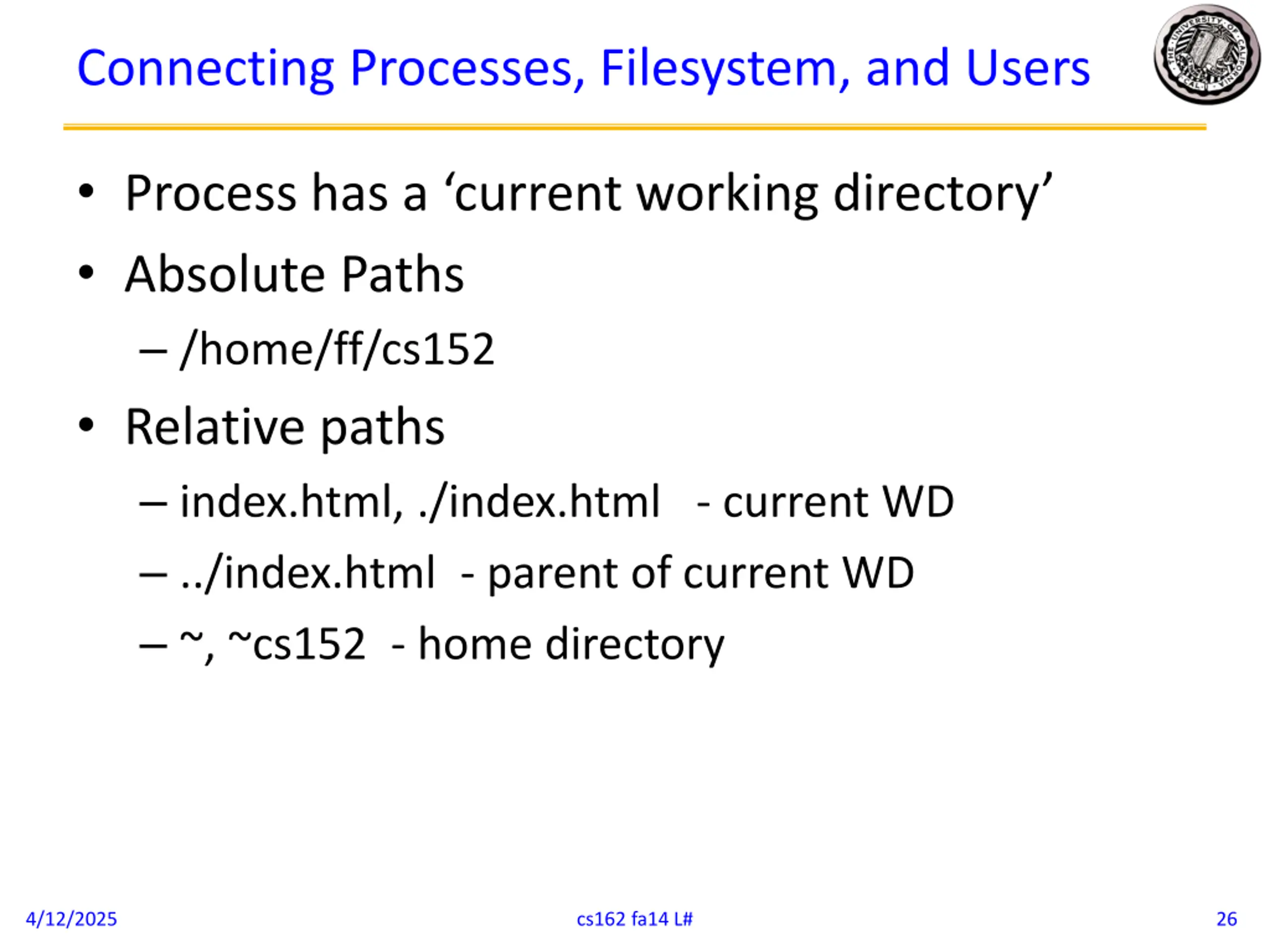 Connecting Processes, Filesystem, and Users Process has a current working directory Absolute Paths /home/ff/cs152 Relative paths index.html, ./index.html - current WD ../index.html - parent of current WD ~, ~cs152 - home directory 4/12/2025 cs162 fa14 L# 26