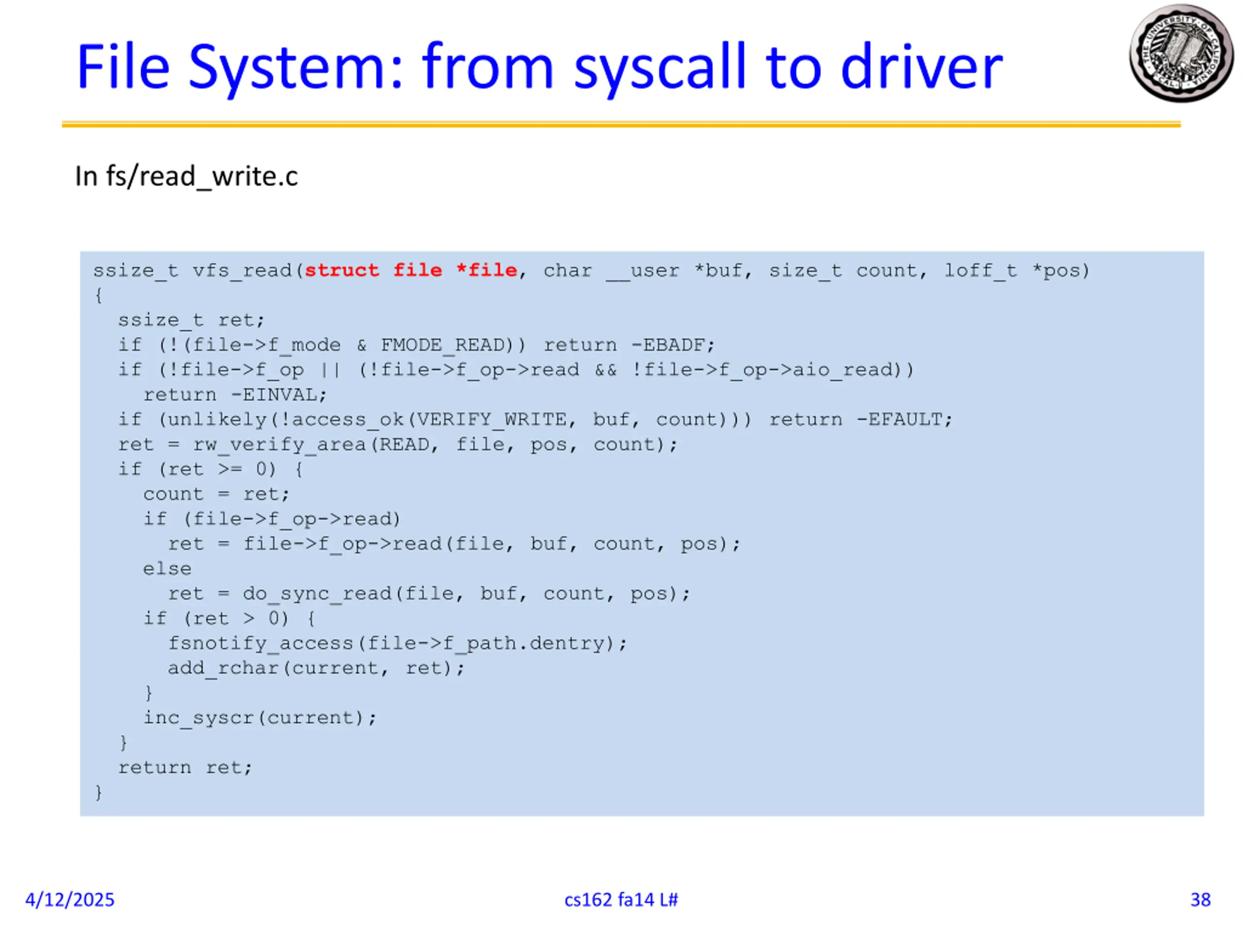 File System: from syscall to driver In fs/read_write.c ssize_t vfs_read(struct file *file, char __user *buf, size_t count, loff_t *pos) { ssize_t ret; if (!(file->f_mode & FMODE_READ)) return -EBADF; if (!file->f_op || (!file->f_op->read && !file->f_op->aio_read)) return -EINVAL; if (unlikely(!access_ok(VERIFY_WRITE, buf, count))) return -EFAULT; ret = rw_verify_area(READ, file, pos, count); if (ret >= 0) { count = ret; if (file->f_op->read) ret = file->f_op->read(file, buf, count, pos); else ret = do_sync_read(file, buf, count, pos); if (ret > 0) { fsnotify_access(file->f_path.dentry); add_rchar(current, ret); } inc_syscr(current); } return ret; } 4/12/2025 cs162 fa14 L# 38
