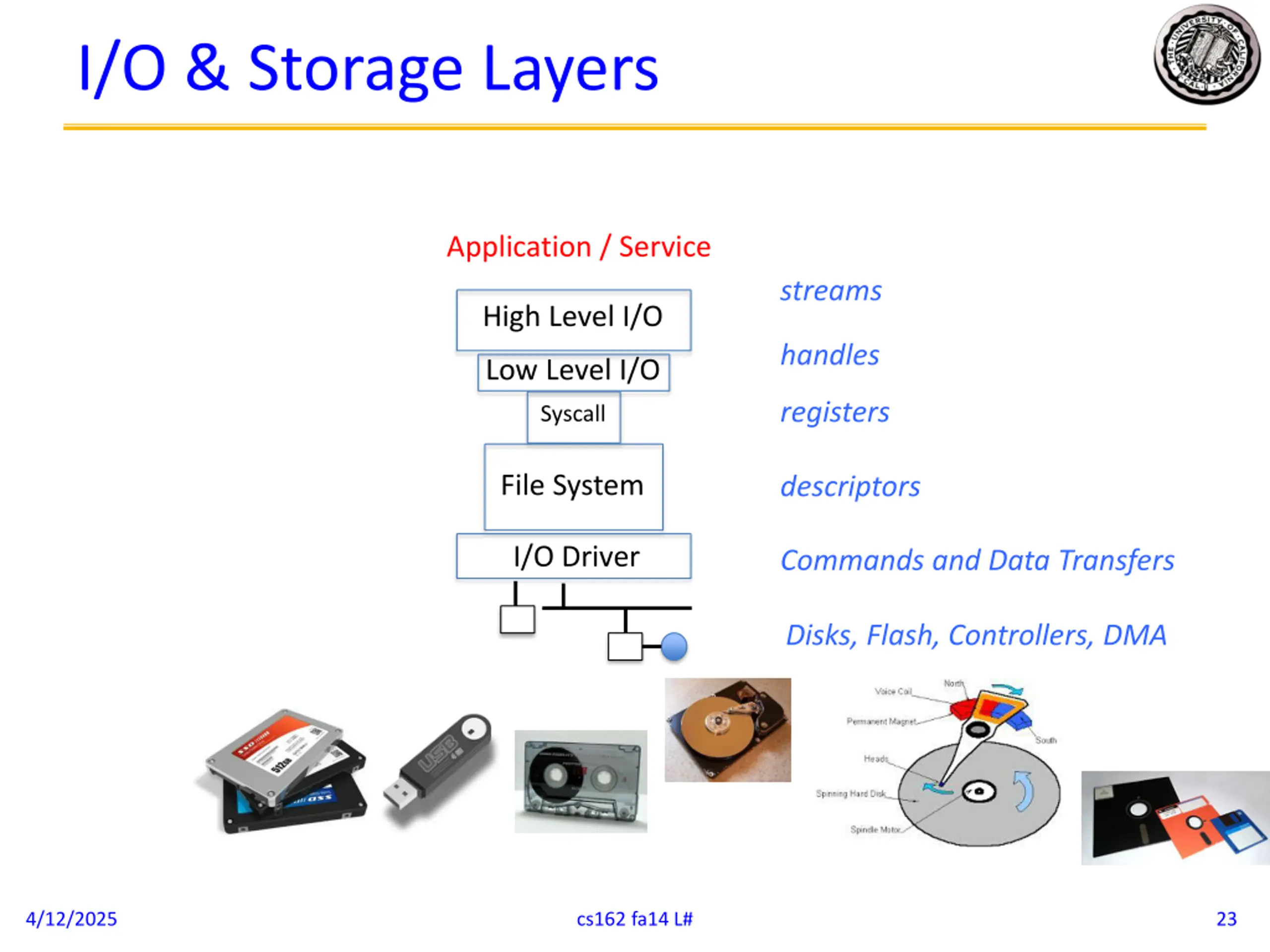 I/O & Storage Layers Application / Service streams High Level I/O handles Low Level I/O registers Syscall File System descriptors I/O Driver Commands and Data Transfers Disks, Flash, Controllers, DMA 4/12/2025 cs162 fa14 L# 23