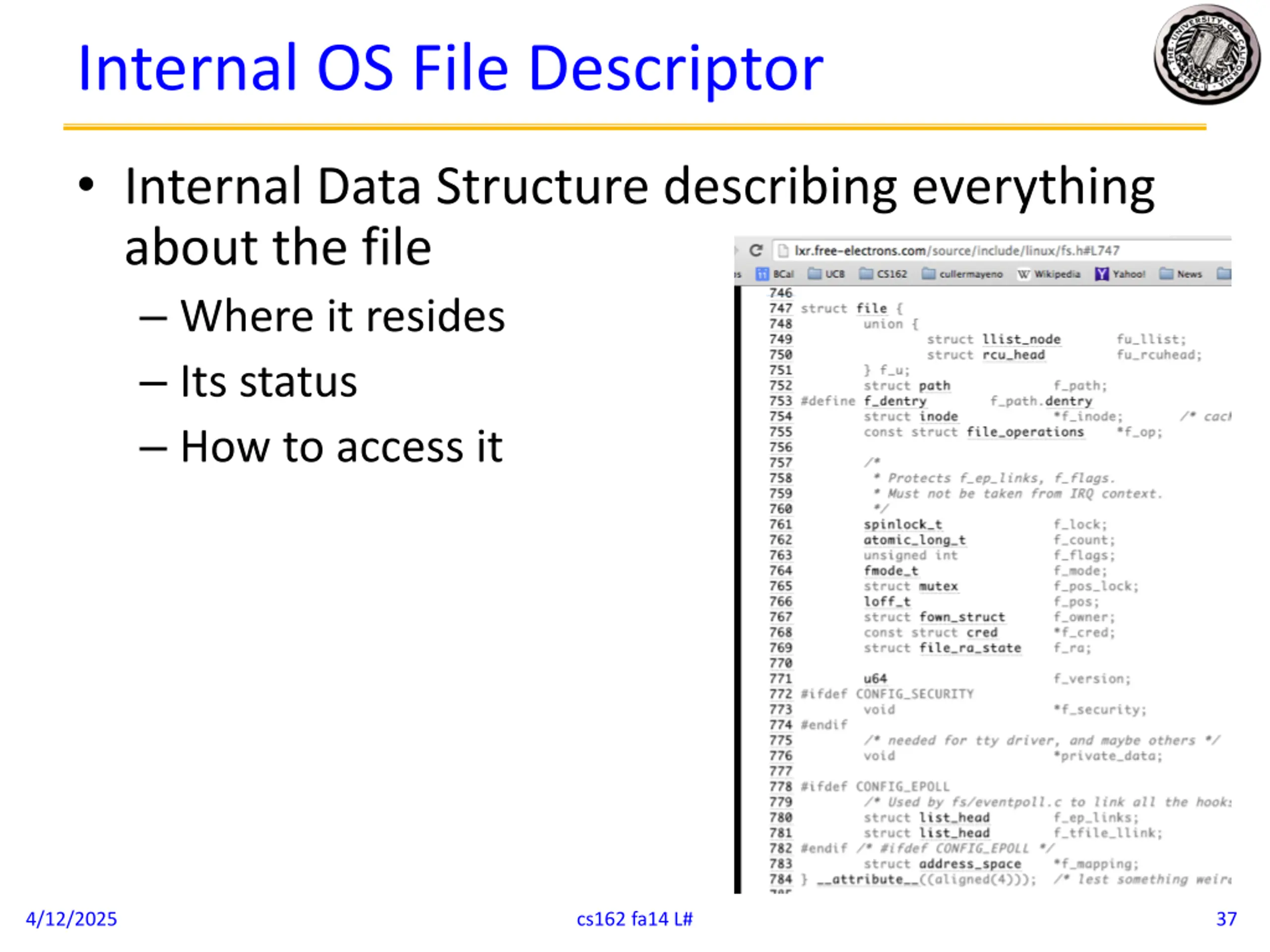 Internal OS File Descriptor Internal Data Structure describing everything about the file Where it resides Its status How to access it 4/12/2025 cs162 fa14 L# 37