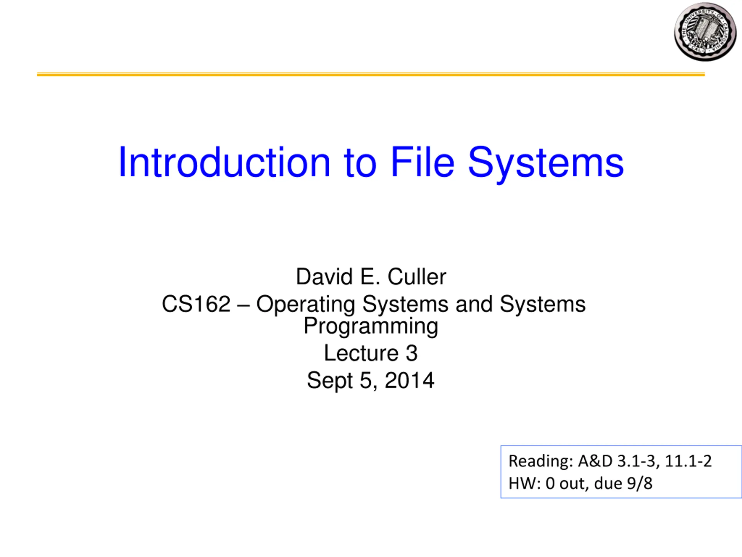 Introduction to File Systems David E. Culler CS162 Operating Systems and Systems Programming Lecture 3 Sept 5, 2014 Reading: A&D 3.1-3, 11.1-2 HW: 0 out, due 9/8