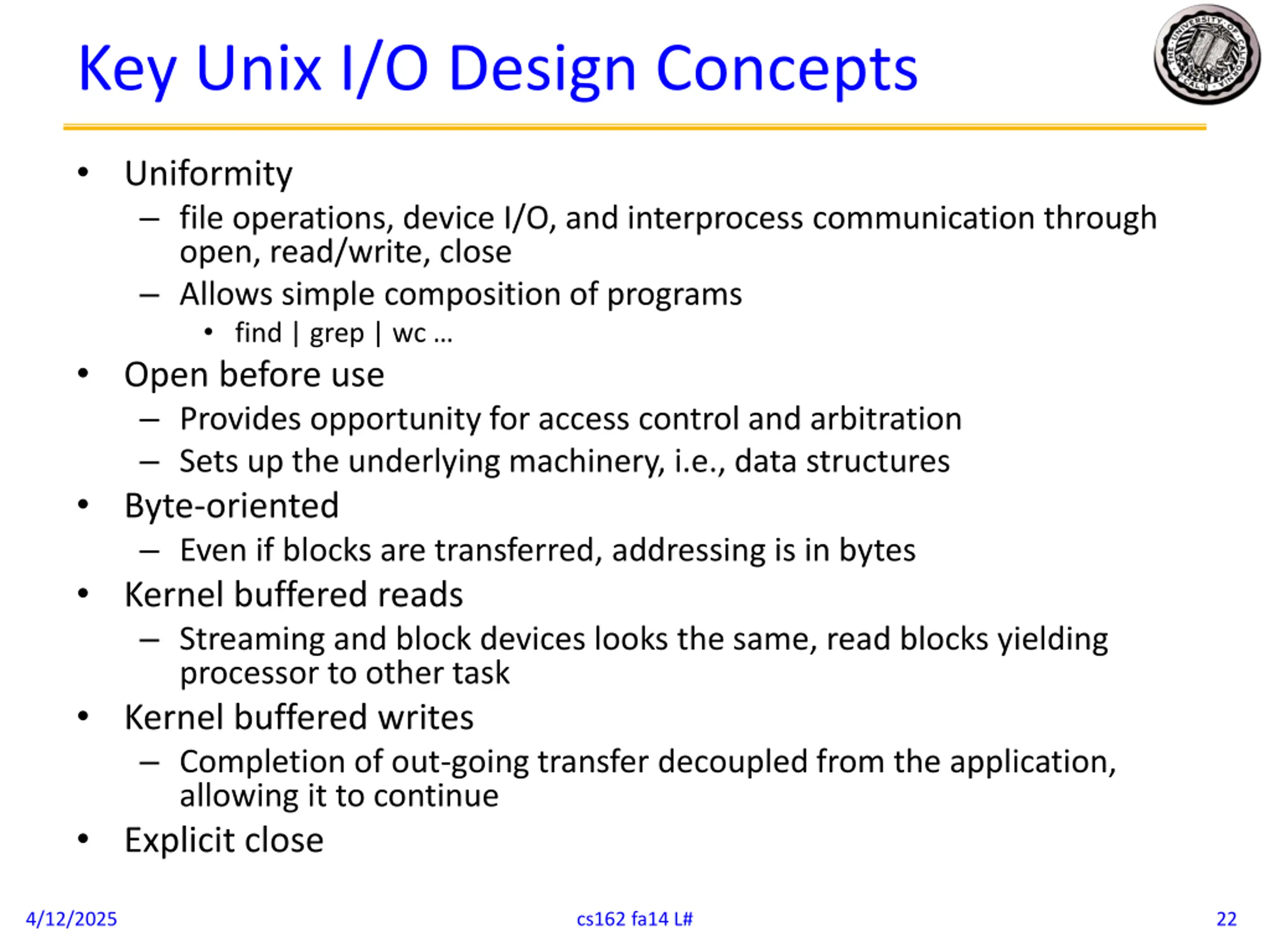 Key Unix I/O Design Concepts Uniformity file operations, device I/O, and interprocess communication through open, read/write, close Allows simple composition of programs find | grep | wc Open before use Provides opportunity for access control and arbitration Sets up the underlying machinery, i.e., data structures Byte-oriented Even if blocks are transferred, addressing is in bytes Kernel buffered reads Streaming and block devices looks the same, read blocks yielding processor to other task Kernel buffered writes Completion of out-going transfer decoupled from the application, allowing it to continue Explicit close 4/12/2025 cs162 fa14 L# 22