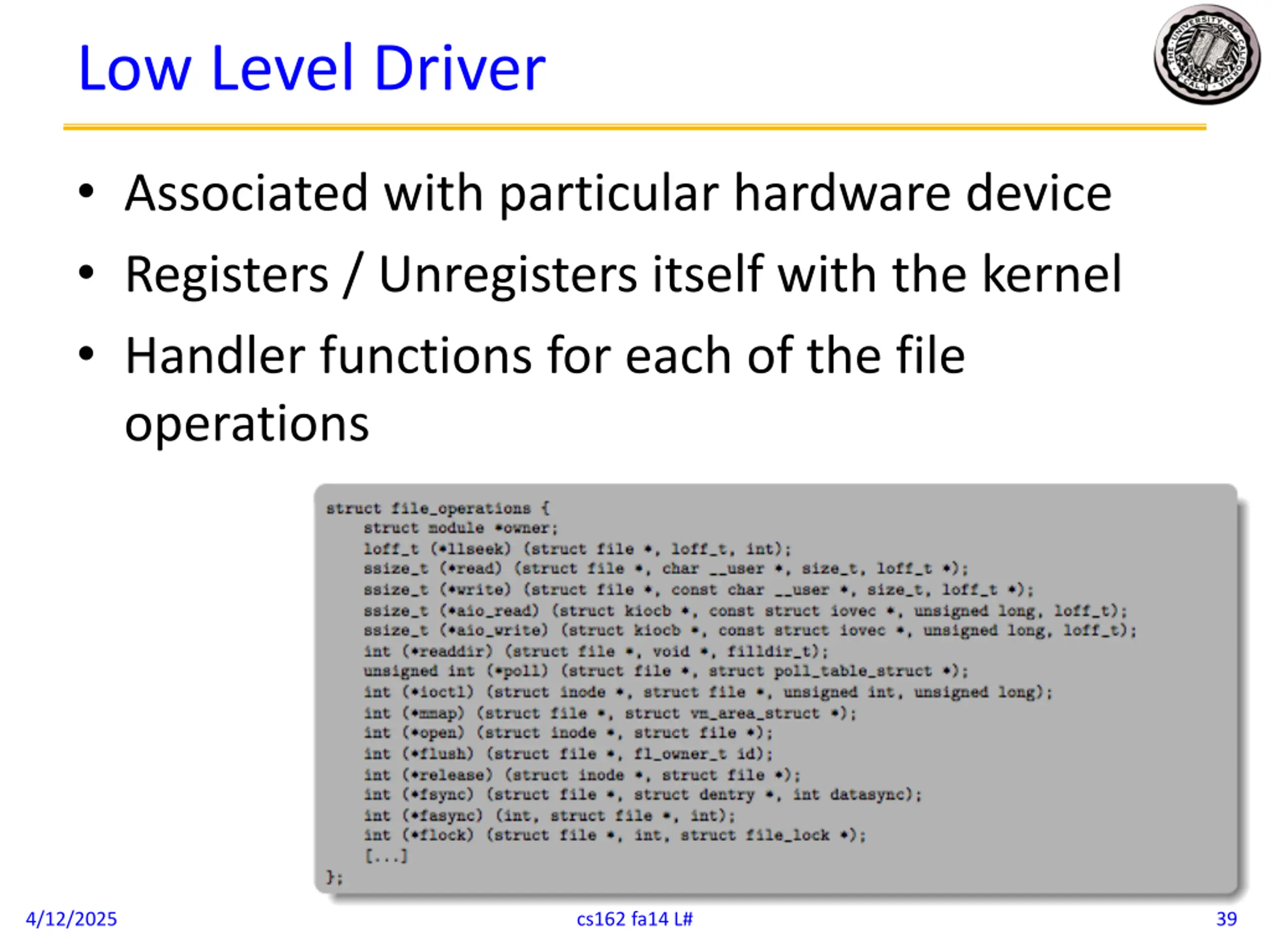 Low Level Driver Associated with particular hardware device Registers / Unregisters itself with the kernel Handler functions for each of the file operations 4/12/2025 cs162 fa14 L# 39