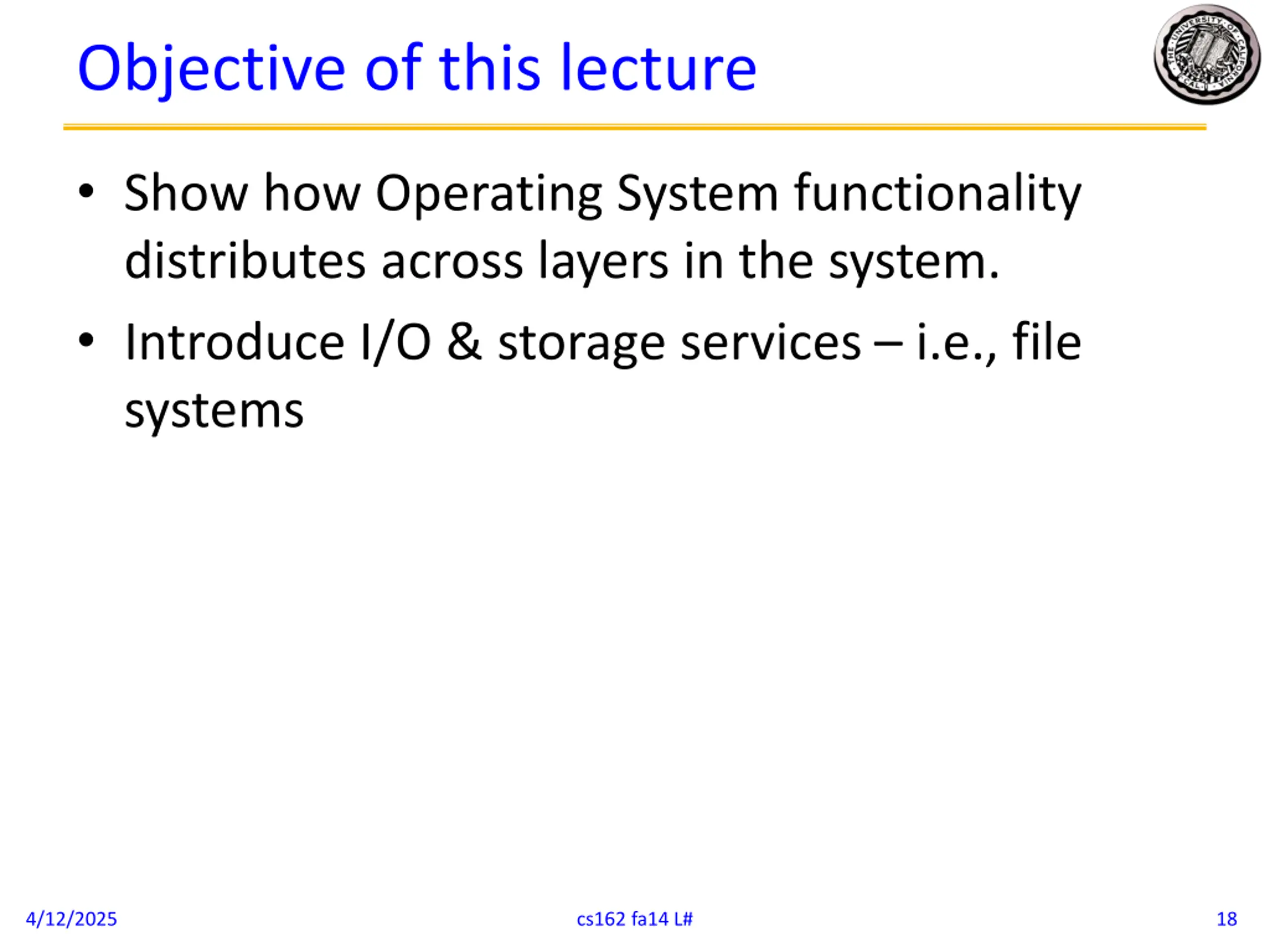 Objective of this lecture Show how Operating System functionality distributes across layers in the system. Introduce I/O & storage services i.e., file systems 4/12/2025 cs162 fa14 L# 18