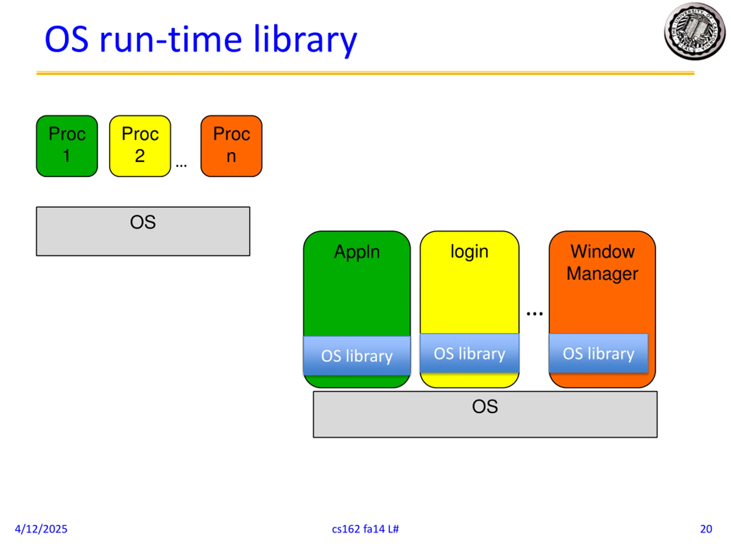 OS run-time library Proc 1 Proc 2 Proc n OS login Window Manager Appln OS library OS library OS library OS 4/12/2025 cs162 fa14 L# 20