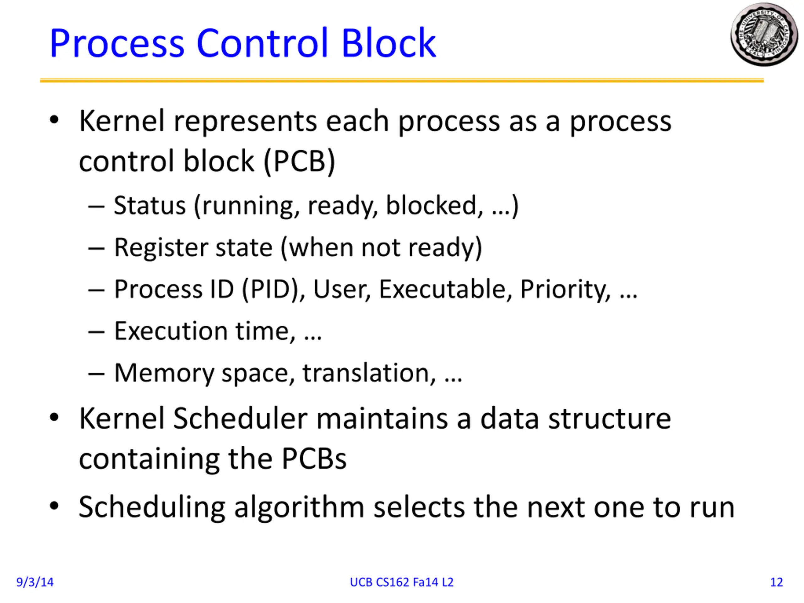 Process Control Block Kernel represents each process as a process control block (PCB) Status (running, ready, blocked, ) Register state (when not ready) Process ID (PID), User, Executable, Priority, Execution time, Memory space, translation, Kernel Scheduler maintains a data structure containing the PCBs Scheduling algorithm selects the next one to run 9/3/14 UCB CS162 Fa14 L2 12