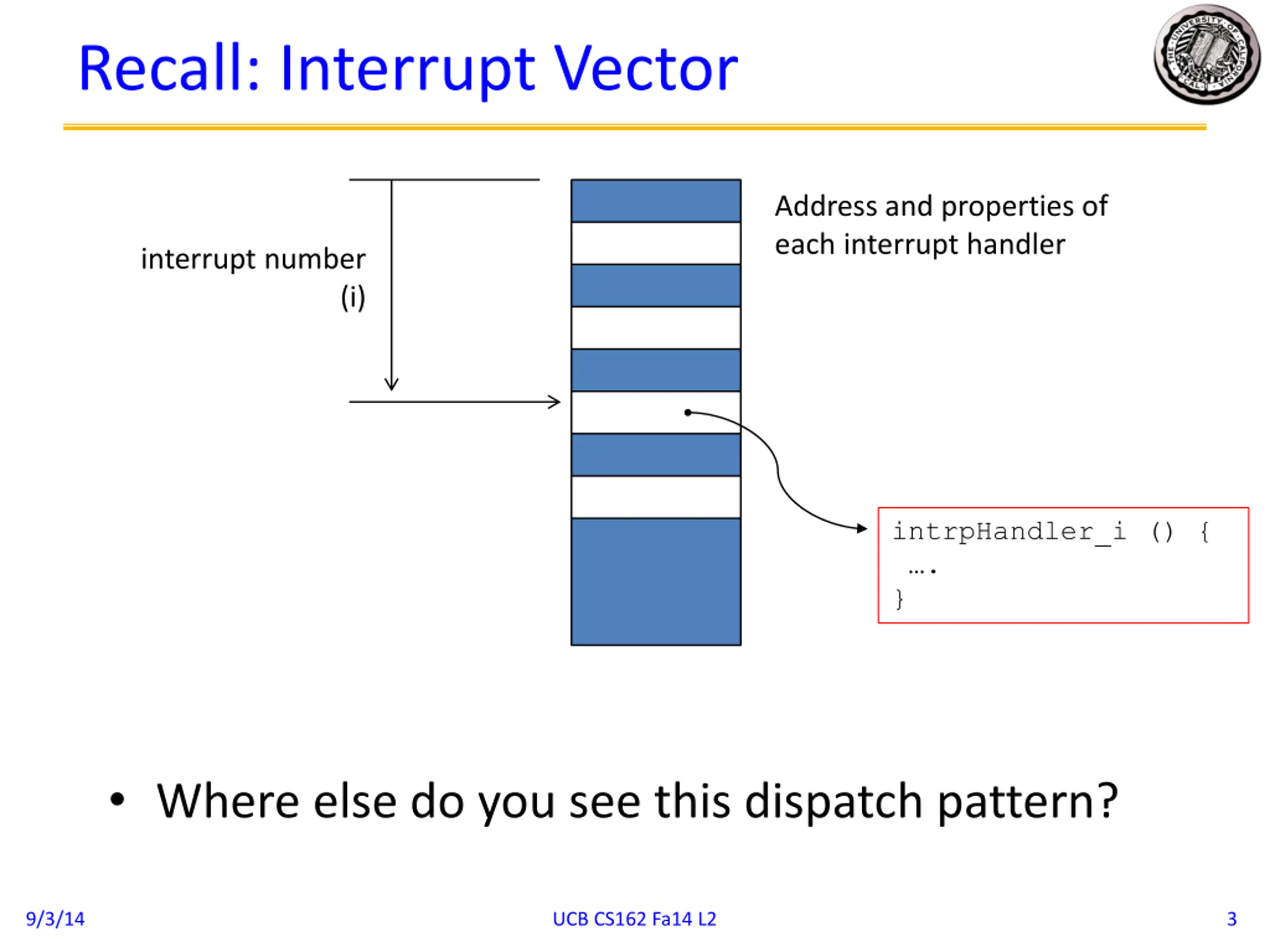 Recall: Interrupt Vector Address and properties of each interrupt handler interrupt number (i) intrpHandler_i () { . } Where else do you see this dispatch pattern? 9/3/14 UCB CS162 Fa14 L2 3