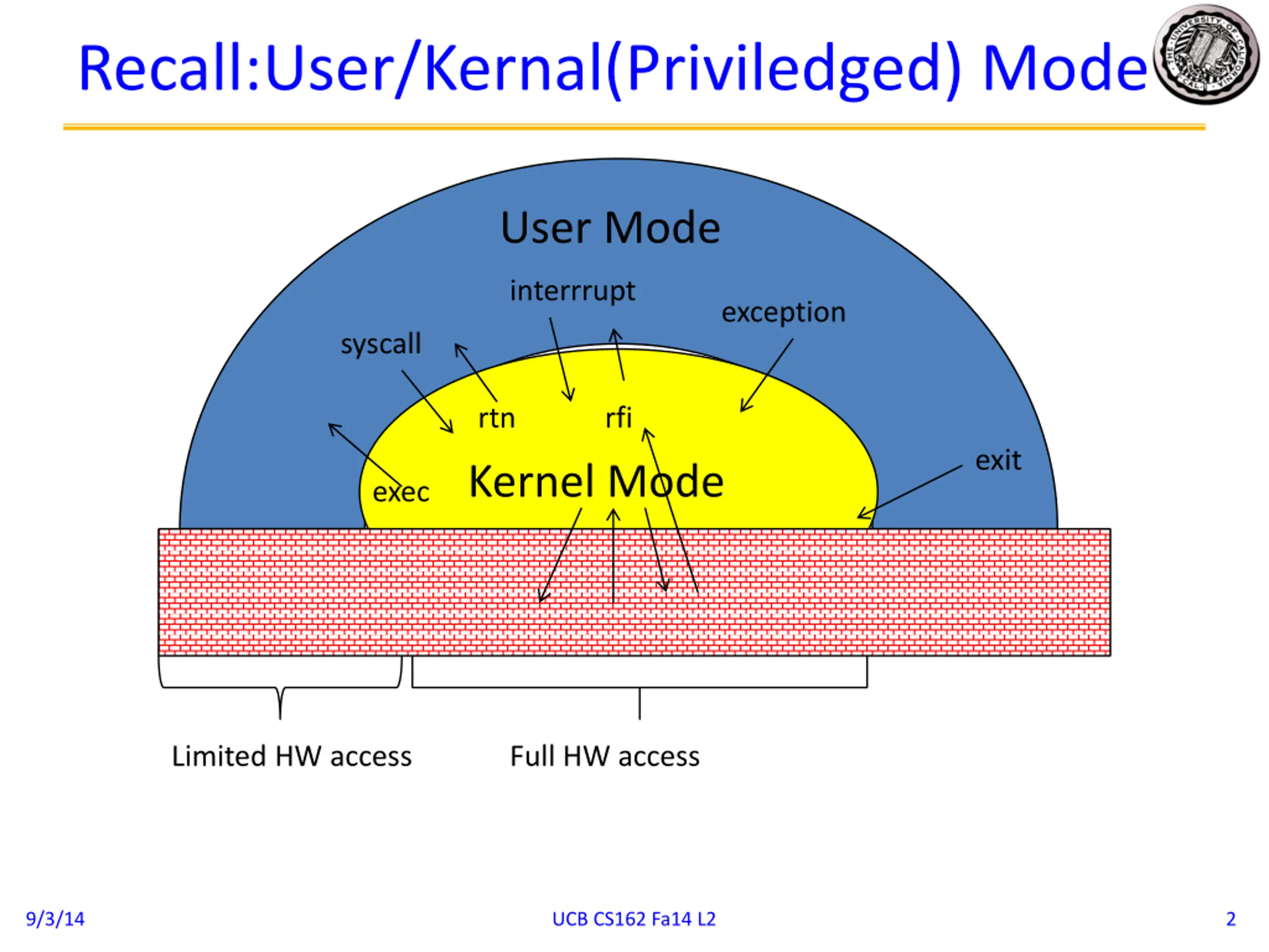 Recall:User/Kernal(Priviledged) Mode User Mode interrrupt exception syscall rtn rfi exit Kernel Mode exec Limited HW access Full HW access 9/3/14 UCB CS162 Fa14 L2 2