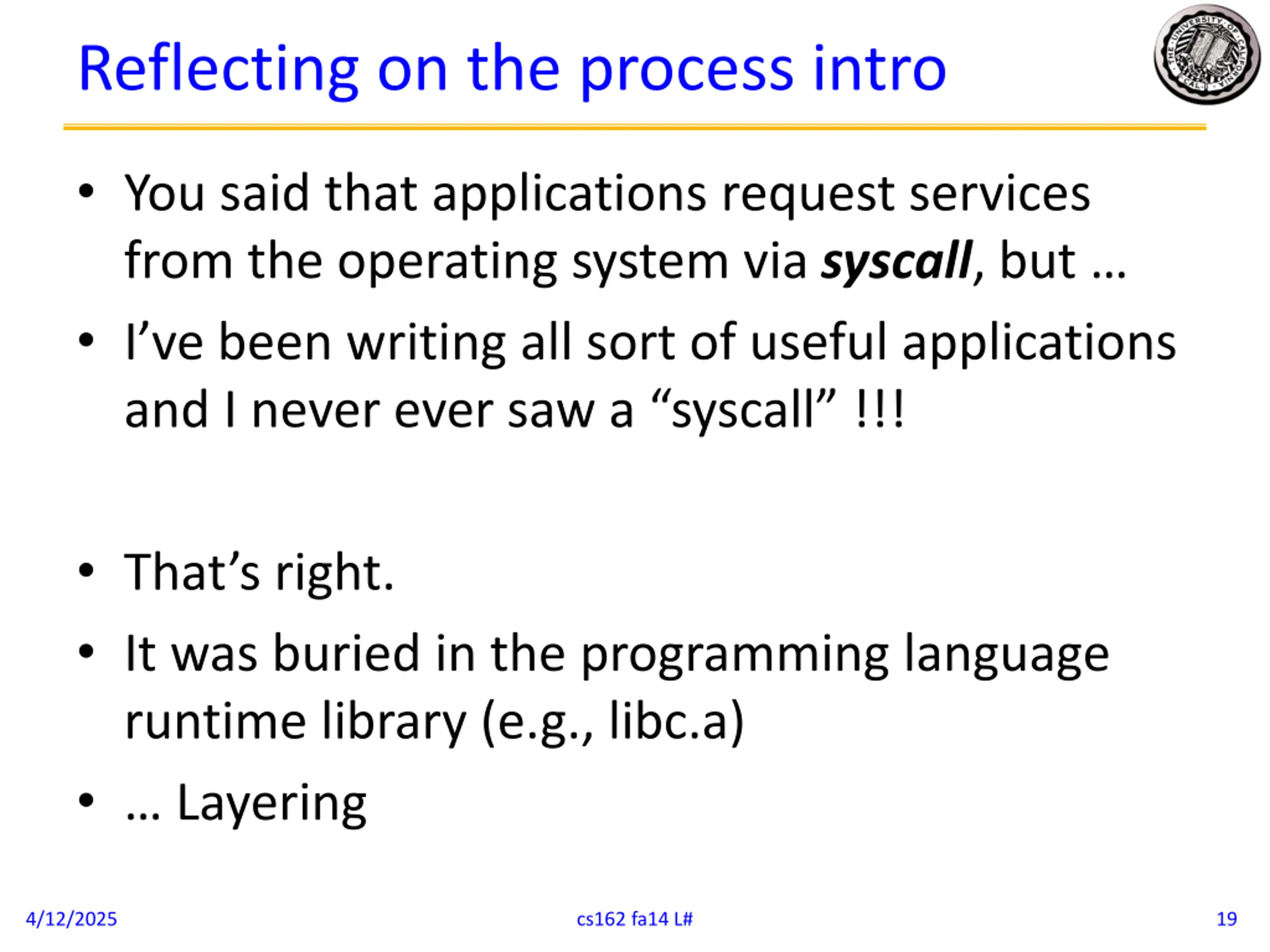 Reflecting on the process intro You said that applications request services from the operating system via syscall, but I ve been writing all sort of useful applications and I never ever saw a syscall !!! That s right. It was buried in the programming language runtime library (e.g., libc.a) Layering 4/12/2025 cs162 fa14 L# 19
