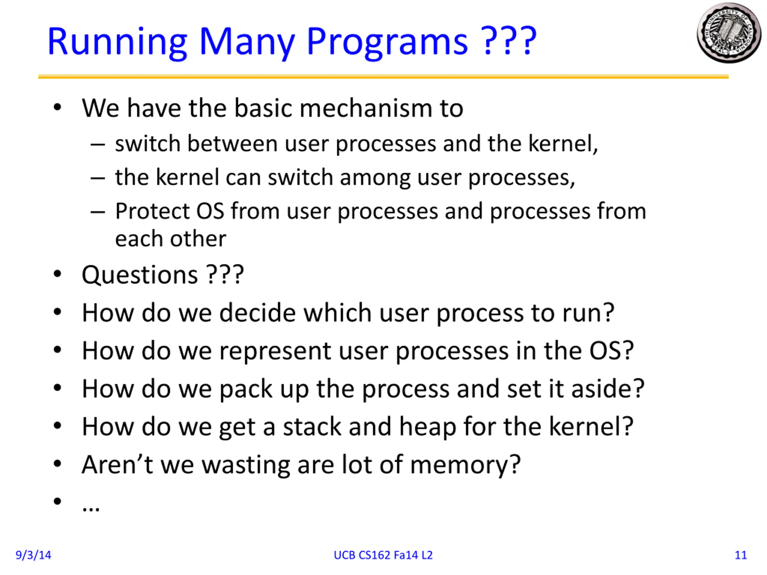 Running Many Programs ??? We have the basic mechanism to switch between user processes and the kernel, the kernel can switch among user processes, Protect OS from user processes and processes from each other Questions ??? How do we decide which user process to run? How do we represent user processes in the OS? How do we pack up the process and set it aside? How do we get a stack and heap for the kernel? Aren t we wasting are lot of memory? 9/3/14 UCB CS162 Fa14 L2 11