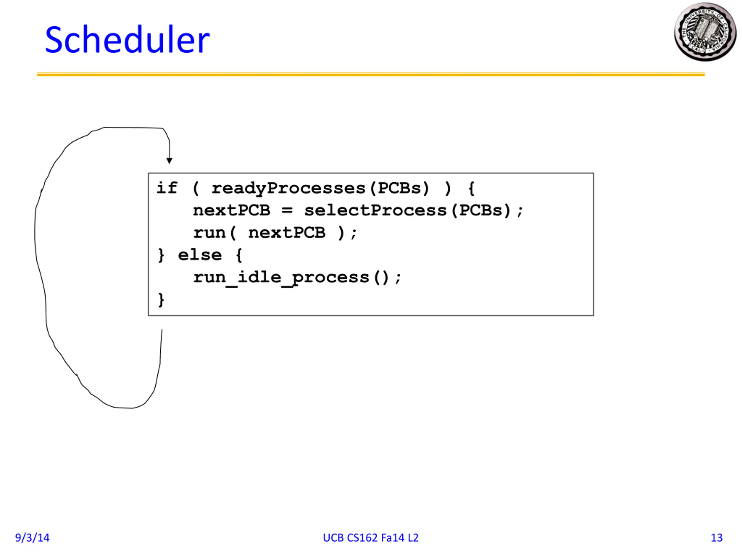 Scheduler if ( readyProcesses(PCBs) ) { nextPCB = selectProcess(PCBs); run( nextPCB ); } else { run_idle_process(); } 9/3/14 UCB CS162 Fa14 L2 13