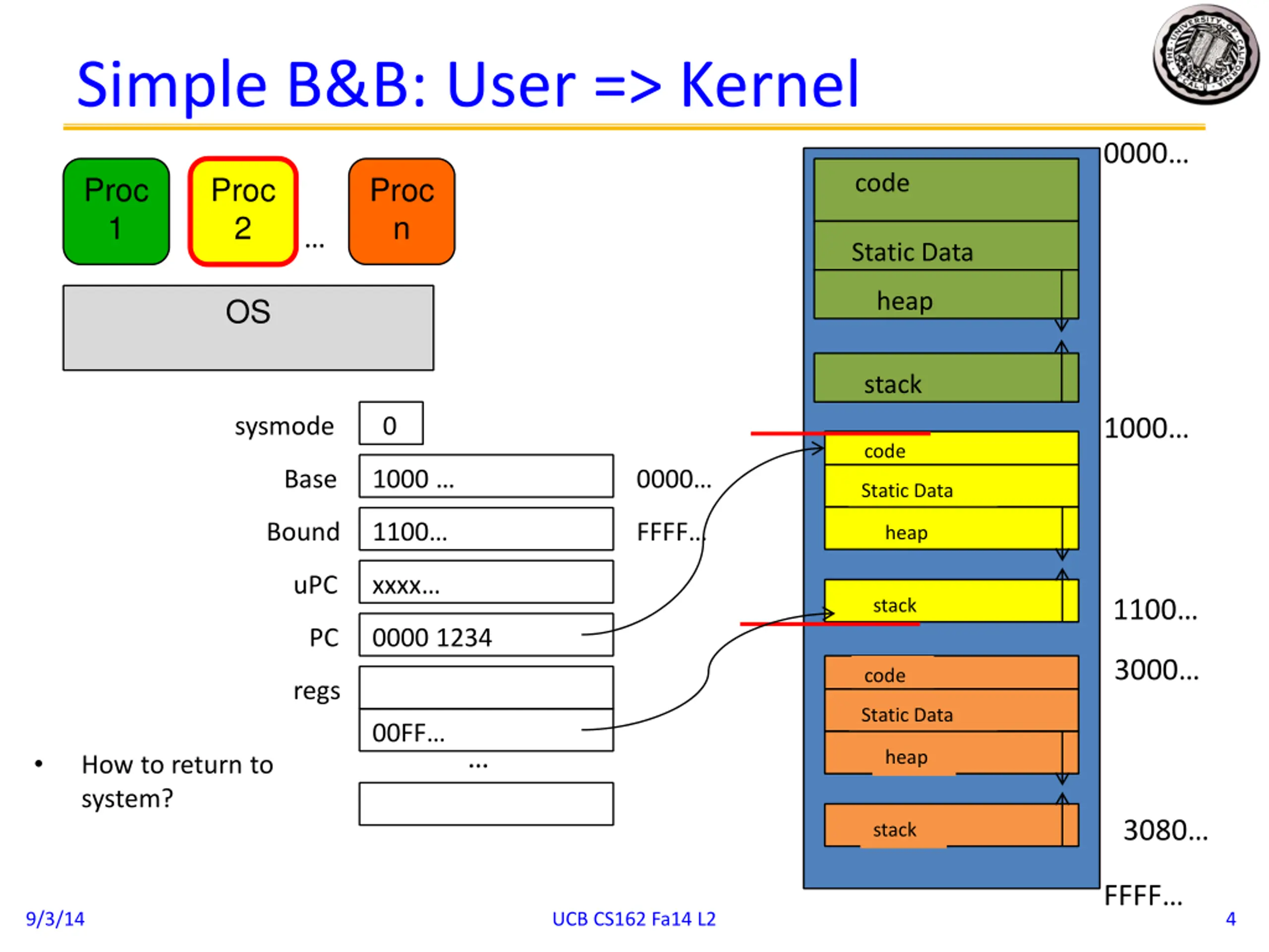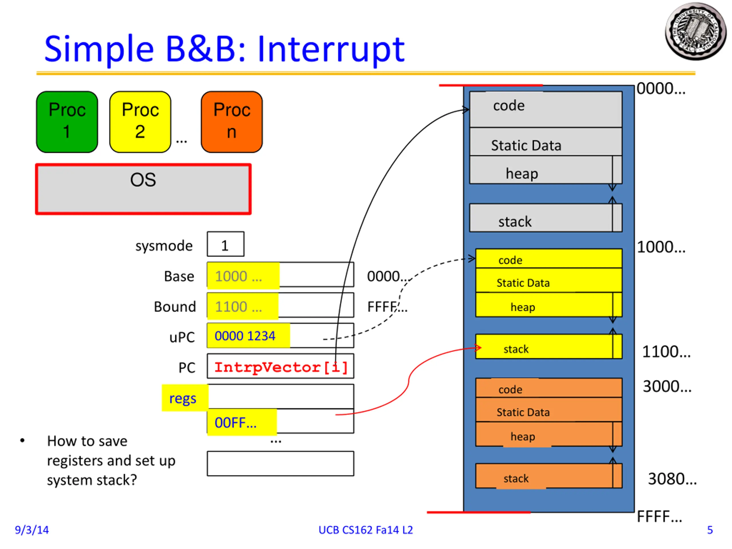 Simple B&B: User => Kernel 0000 code Proc 1 Proc 2 Proc n Static Data heap OS stack sysmode 0 1000 code Base 1000 0000 Static Data Bound 1100 FFFF heap uPC xxxx 1100 stack PC 0000 1234 3000 code regs Static Data 00FF heap How to return to system? 3080 stack FFFF 9/3/14 UCB CS162 Fa14 L2 4