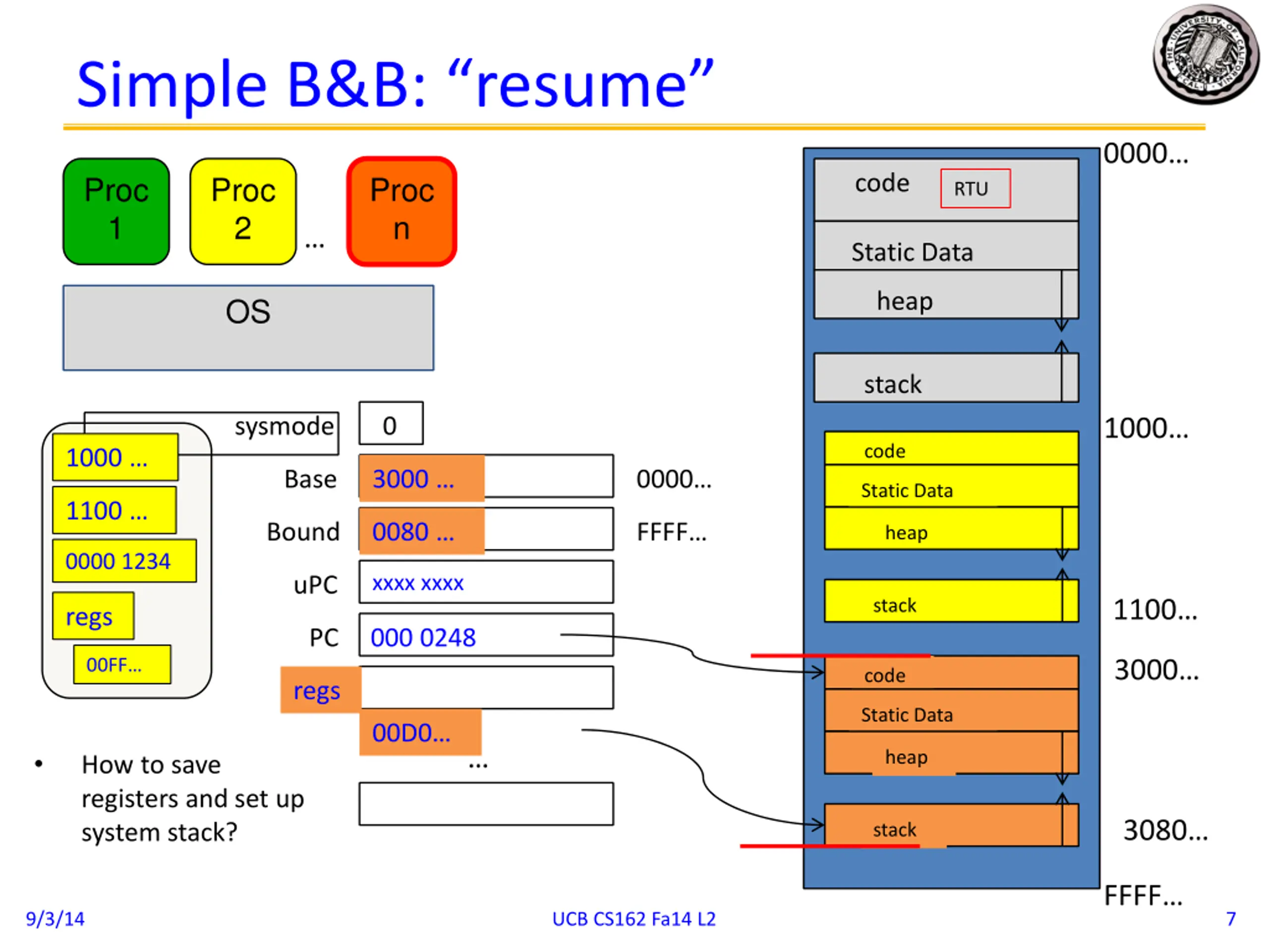 Simple B&B: resume 0000 code Proc 1 Proc 2 Proc n RTU Static Data heap OS stack sysmode 0 1000 code 1000 Base 3000 0000 Static Data 1100 Bound 0080 FFFF heap 0000 1234 xxxx xxxx uPC 1100 stack regs PC 000 0248 00FF 3000 code regs Static Data 00D0 heap How to save registers and set up system stack? 3080 stack FFFF 9/3/14 UCB CS162 Fa14 L2 7