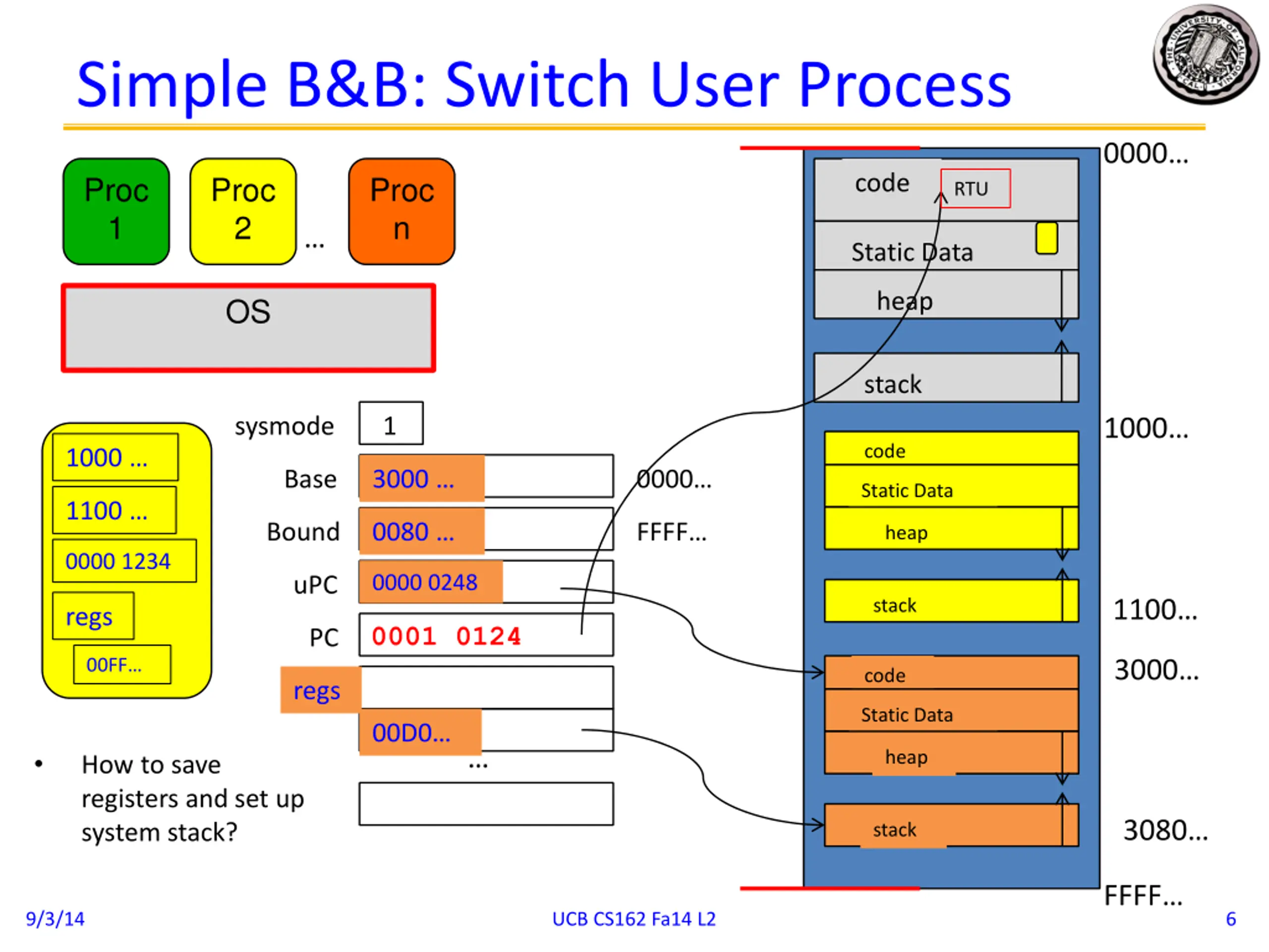 Simple B&B: Switch User Process 0000 code Proc 1 Proc 2 Proc n RTU Static Data heap OS stack sysmode 1 1000 code 1000 Base 3000 0000 Static Data 1100 Bound 0080 FFFF heap 0000 1234 0000 0248 uPC 1100 stack regs 0001 0124 PC 00FF 3000 code regs Static Data 00D0 heap How to save registers and set up system stack? 3080 stack FFFF 9/3/14 UCB CS162 Fa14 L2 6