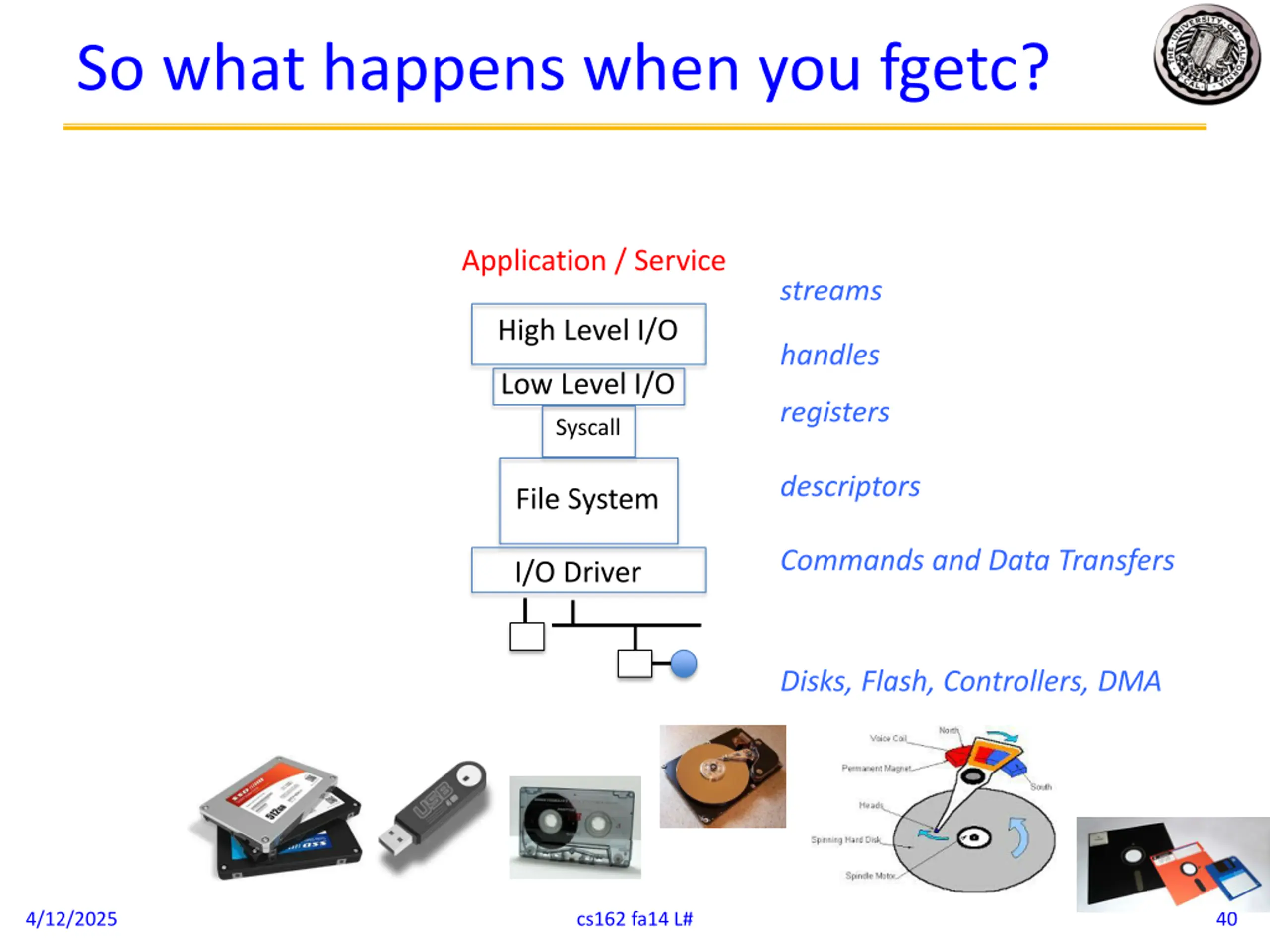 So what happens when you fgetc? Application / Service streams High Level I/O handles Low Level I/O registers Syscall descriptors File System Commands and Data Transfers I/O Driver Disks, Flash, Controllers, DMA 4/12/2025 cs162 fa14 L# 40