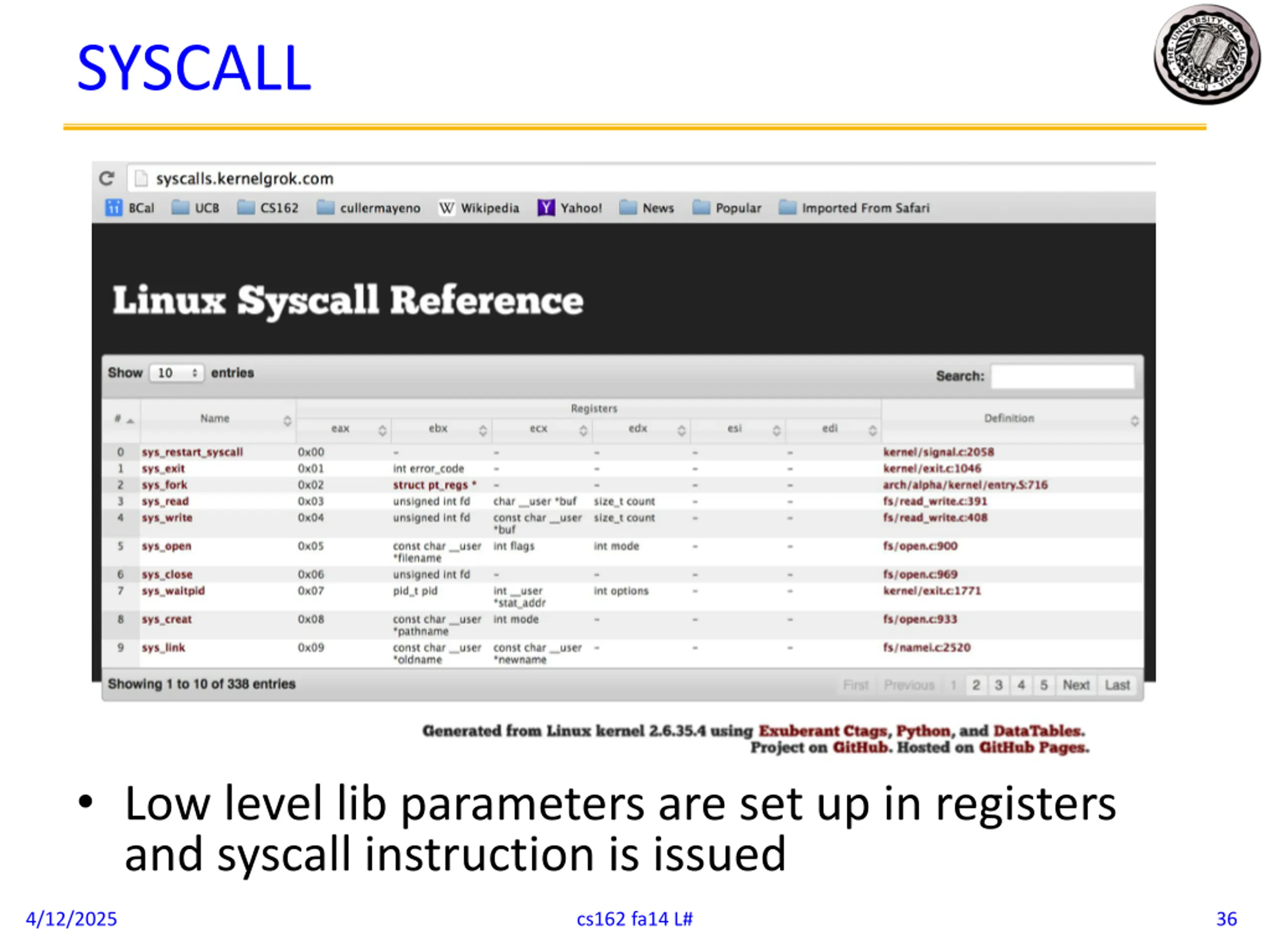 SYSCALL Low level lib parameters are set up in registers and syscall instruction is issued 4/12/2025 cs162 fa14 L# 36