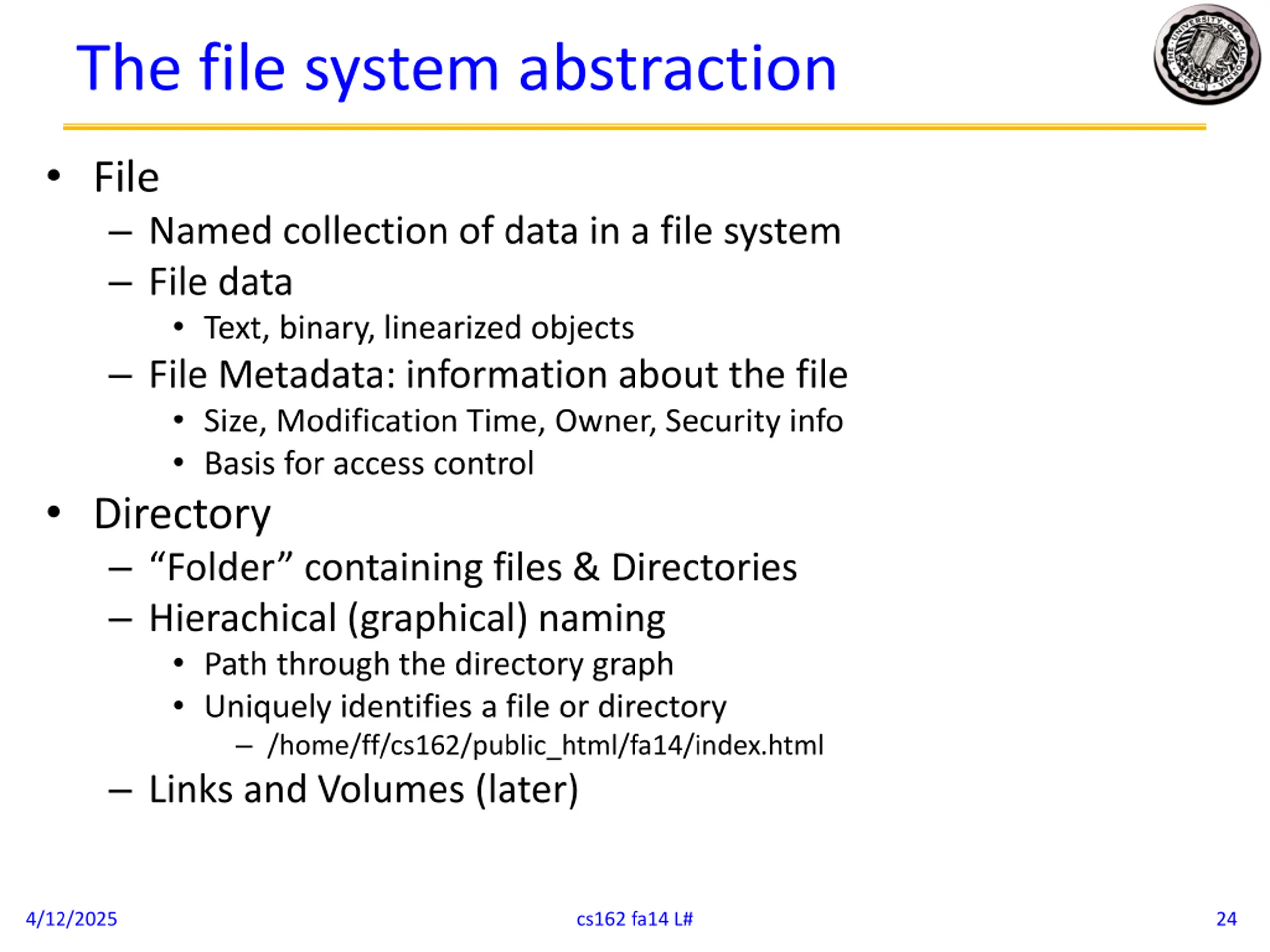 The file system abstraction File Named collection of data in a file system File data Text, binary, linearized objects File Metadata: information about the file Size, Modification Time, Owner, Security info Basis for access control Directory Folder containing files & Directories Hierachical (graphical) naming Path through the directory graph Uniquely identifies a file or directory /home/ff/cs162/public_html/fa14/index.html Links and Volumes (later) 4/12/2025 cs162 fa14 L# 24