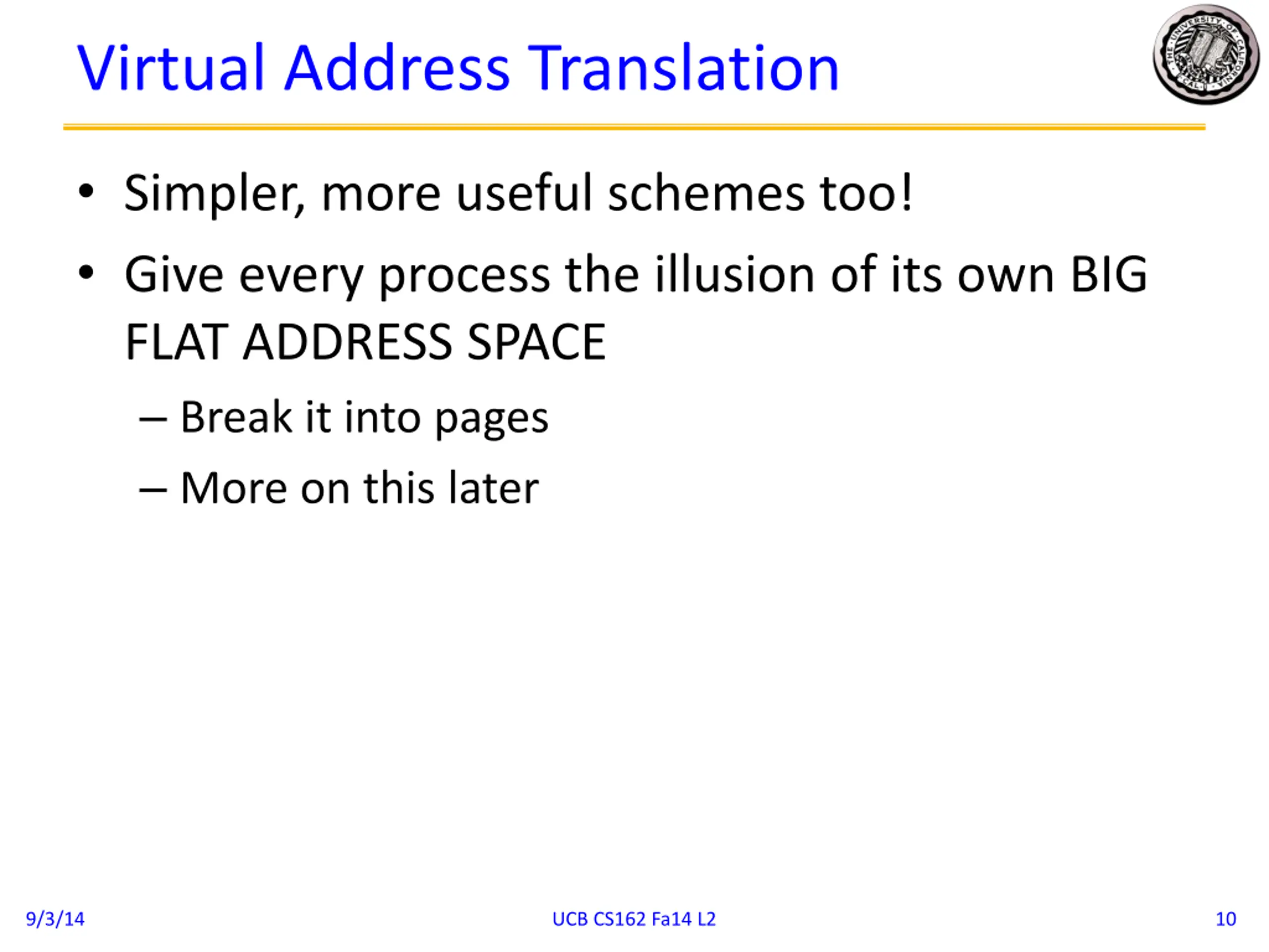 Virtual Address Translation Simpler, more useful schemes too! Give every process the illusion of its own BIG FLAT ADDRESS SPACE Break it into pages More on this later 9/3/14 UCB CS162 Fa14 L2 10