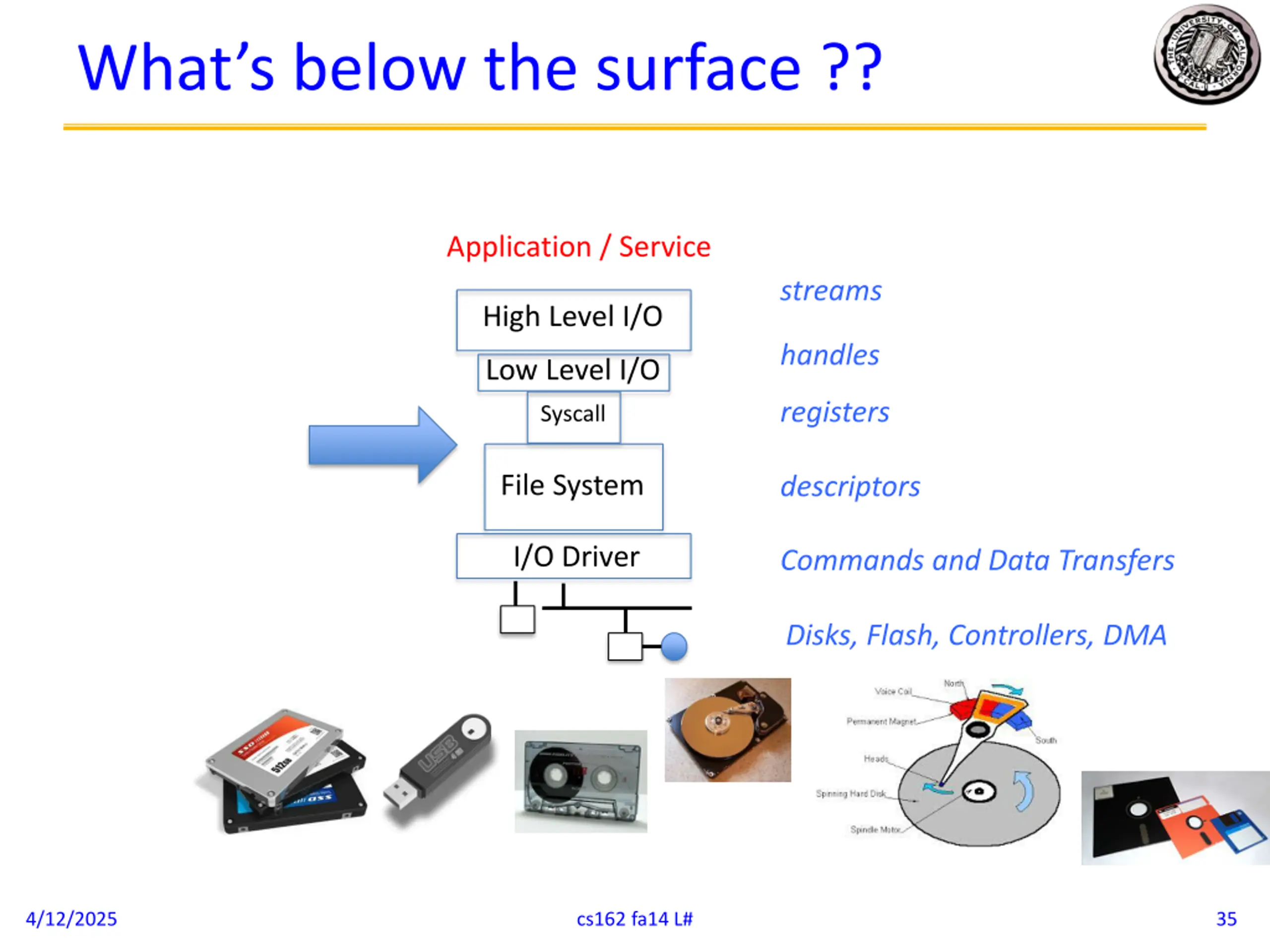 Whats below the surface ?? Application / Service streams High Level I/O handles Low Level I/O registers Syscall File System descriptors I/O Driver Commands and Data Transfers Disks, Flash, Controllers, DMA 4/12/2025 cs162 fa14 L# 35