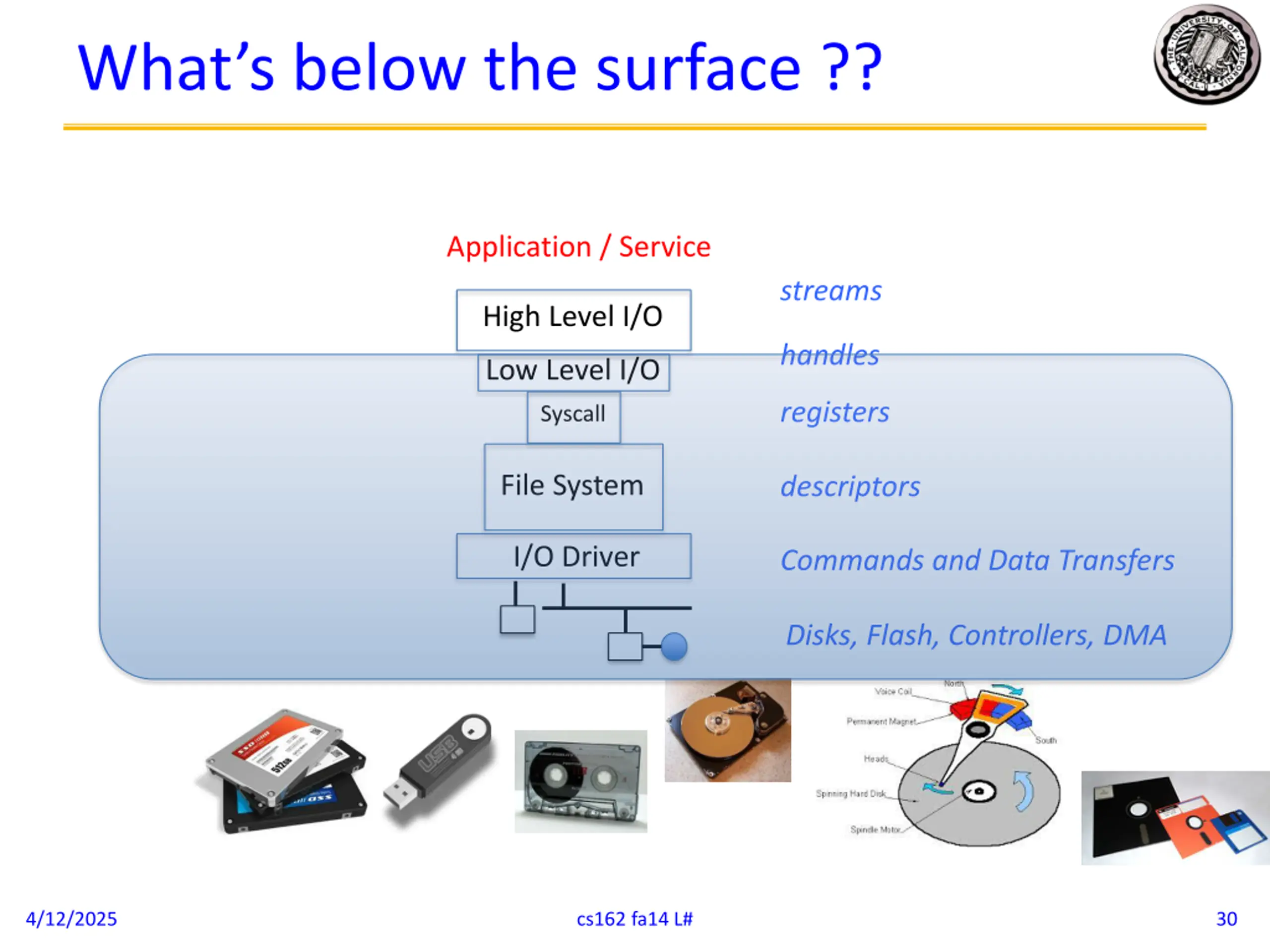 Whats below the surface ?? Application / Service streams High Level I/O handles Low Level I/O registers Syscall File System descriptors I/O Driver Commands and Data Transfers Disks, Flash, Controllers, DMA 4/12/2025 cs162 fa14 L# 30