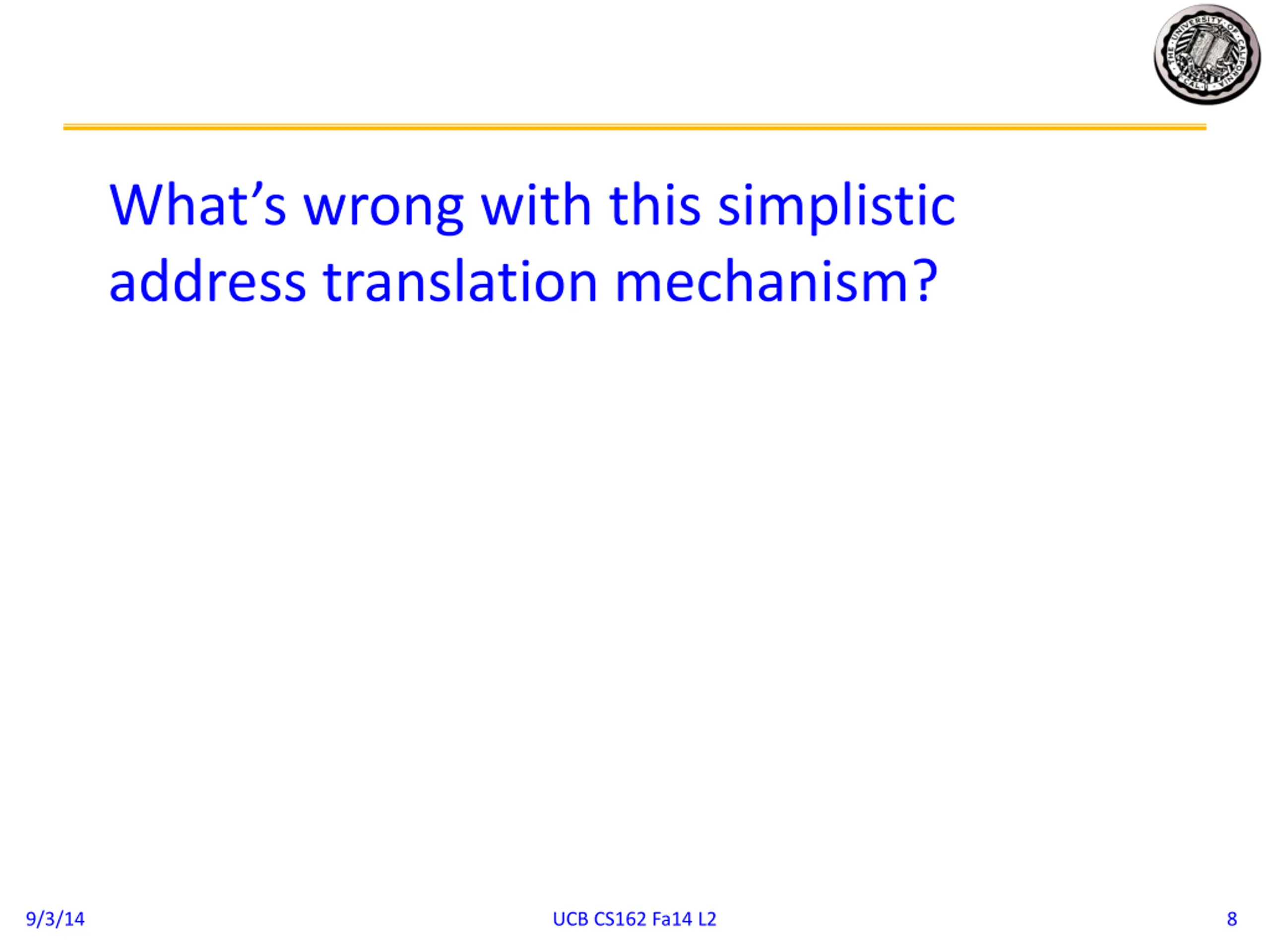 Whats wrong with this simplistic address translation mechanism? 9/3/14 UCB CS162 Fa14 L2 8