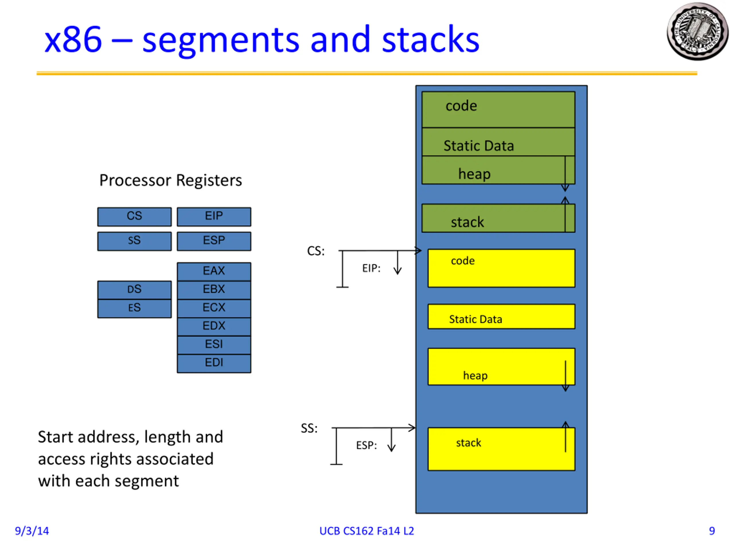 x86 segments and stacks code Static Data heap Processor Registers CS EIP stack SS ESP CS: code EIP: EAX EBX DS ES ECX EDX ESI EDI Static Data heap SS: Start address, length and access rights associated with each segment stack ESP: 9/3/14 UCB CS162 Fa14 L2 9