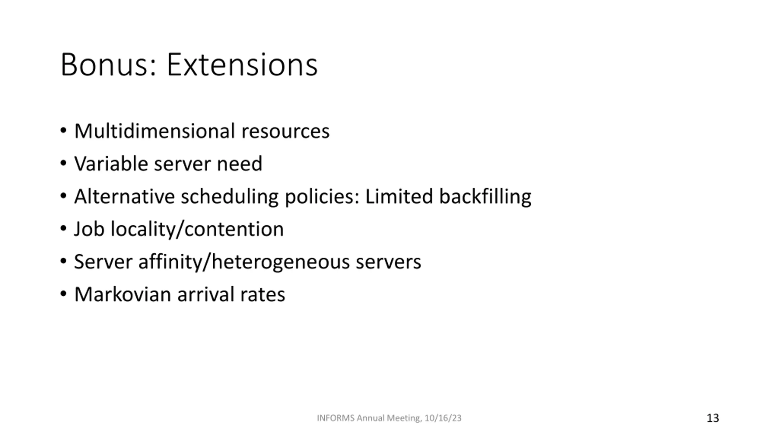 Bonus: Extensions Multidimensional resources Variable server need Alternative scheduling policies: Limited backfilling Job locality/contention Server affinity/heterogeneous servers Markovian arrival rates 13 INFORMS Annual Meeting, 10/16/23