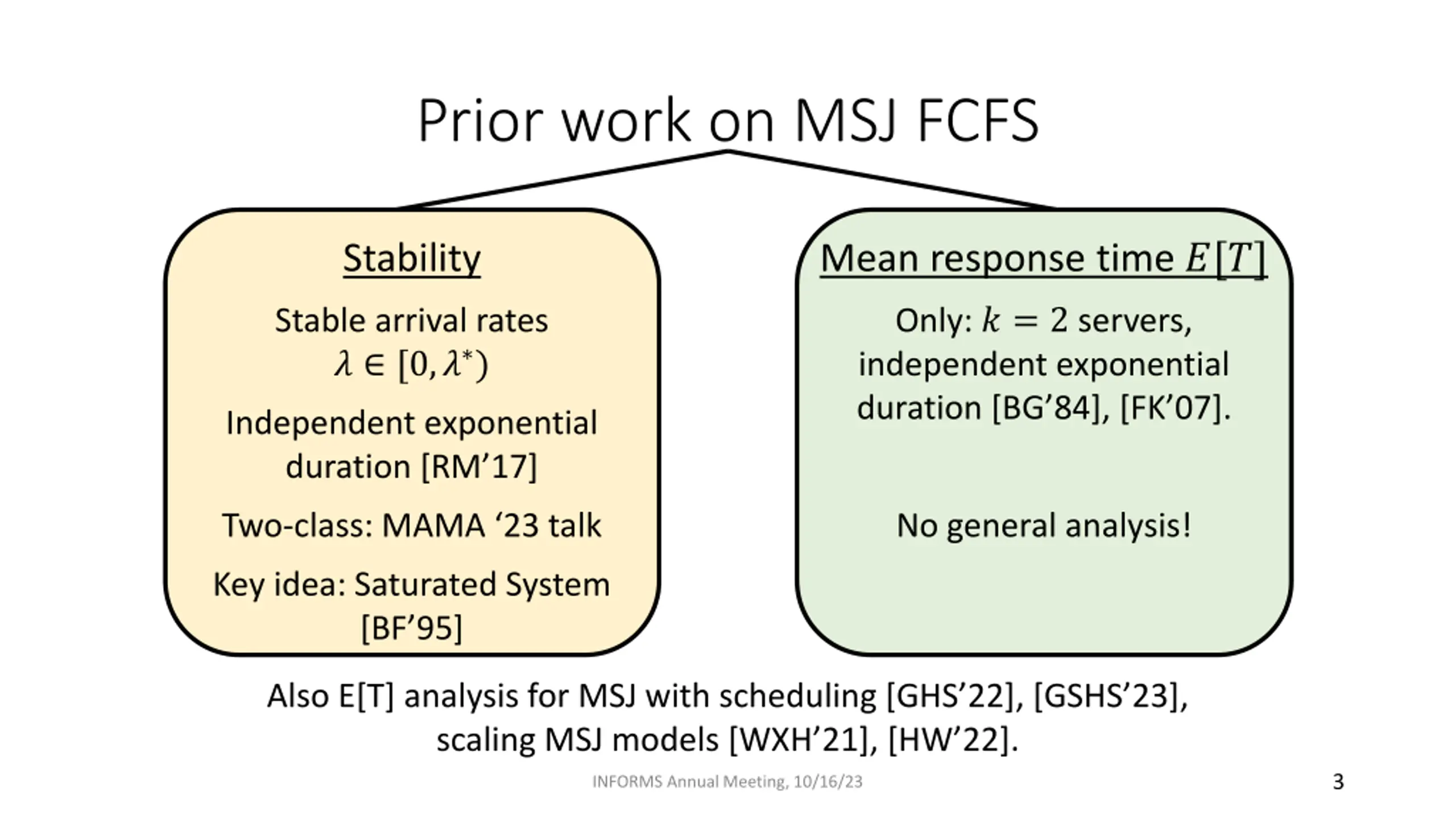 Prior work on MSJ FCFS Mean response time ?[?] Stability Only: ? = 2 servers, independent exponential duration [BG 84], [FK 07]. Stable arrival rates ? [0,? ) Independent exponential duration [RM 17] Two-class: MAMA 23 talk No general analysis! Key idea: Saturated System [BF 95] Also E[T] analysis for MSJ with scheduling [GHS 22], [GSHS 23], scaling MSJ models [WXH 21], [HW 22]. 3 INFORMS Annual Meeting, 10/16/23
