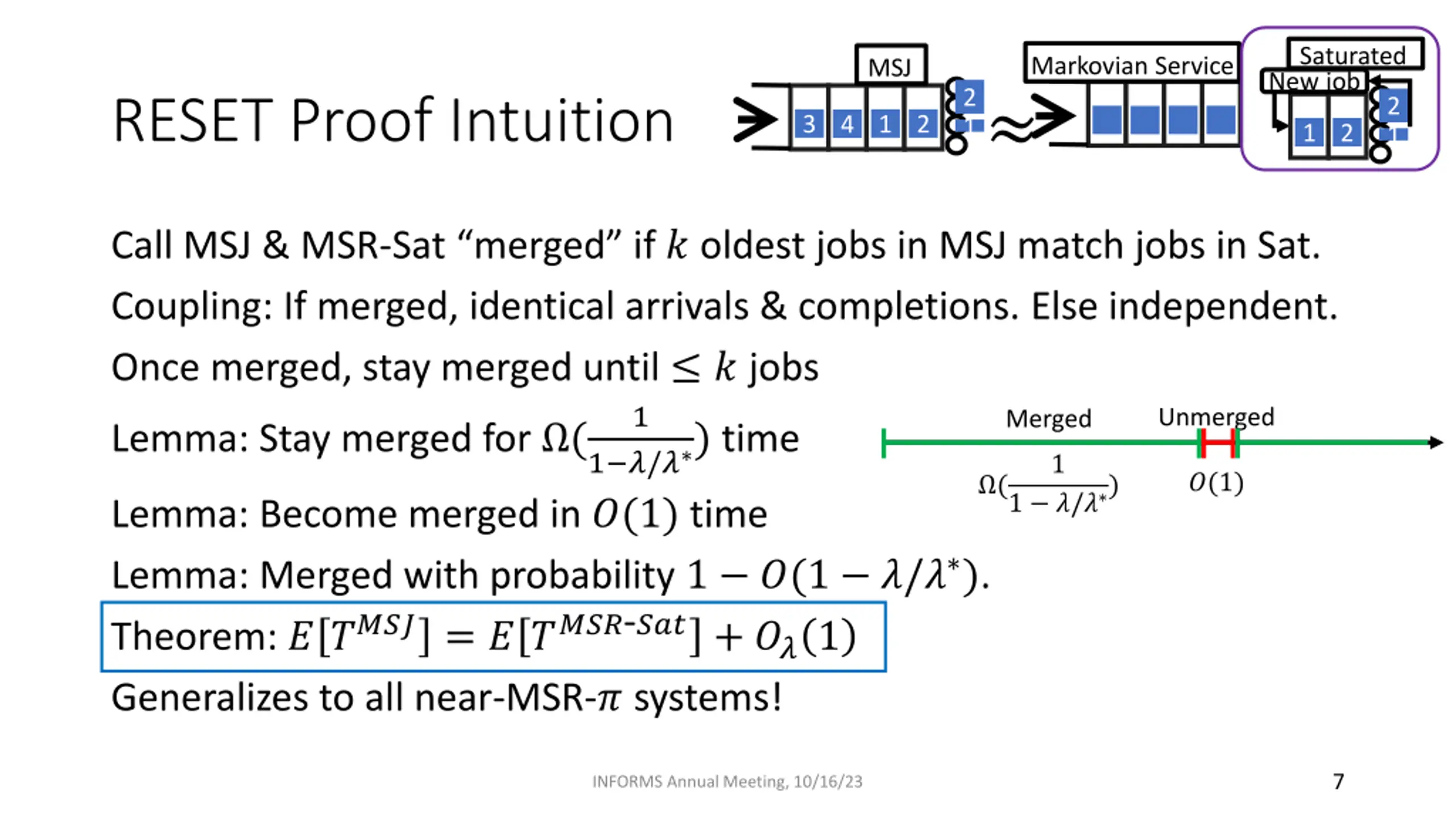 Saturated Markovian Service MSJ New job 2 1 RESET Theorem 2 1 3 2 1 4 2 1 RESET: Reduction to Saturated for Expected Time RESET Theorem: ? ????= ? ???? ???+ ??1 Intuition: MSJ and MSR-Sat couple perfectly, except if ? jobs present. 6 INFORMS Annual Meeting, 10/16/23