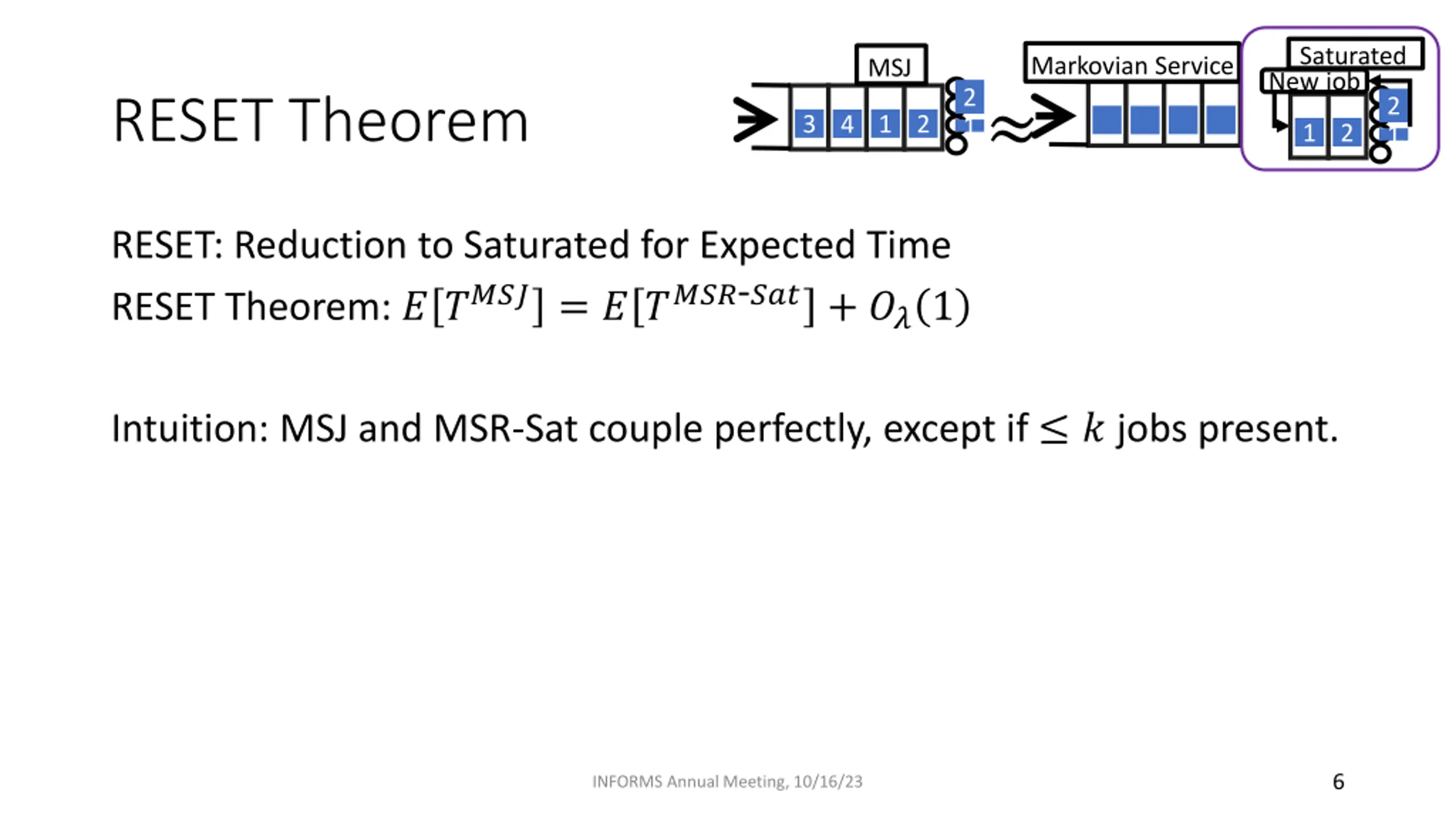 External service process Result & Key Insight Saturated System New job Result: First Analysis of MSJ FCFS ? ? Tight in heavy traffic (? ? ) Key idea: MSJ 2 1 2 1 Markovian Service Rate 2 1 3 2 1 4 Solve ? ???? ???, Solve ?[????]! MARC RESET ?[???? ???]? ?[????]? 5 INFORMS Annual Meeting, 10/16/23