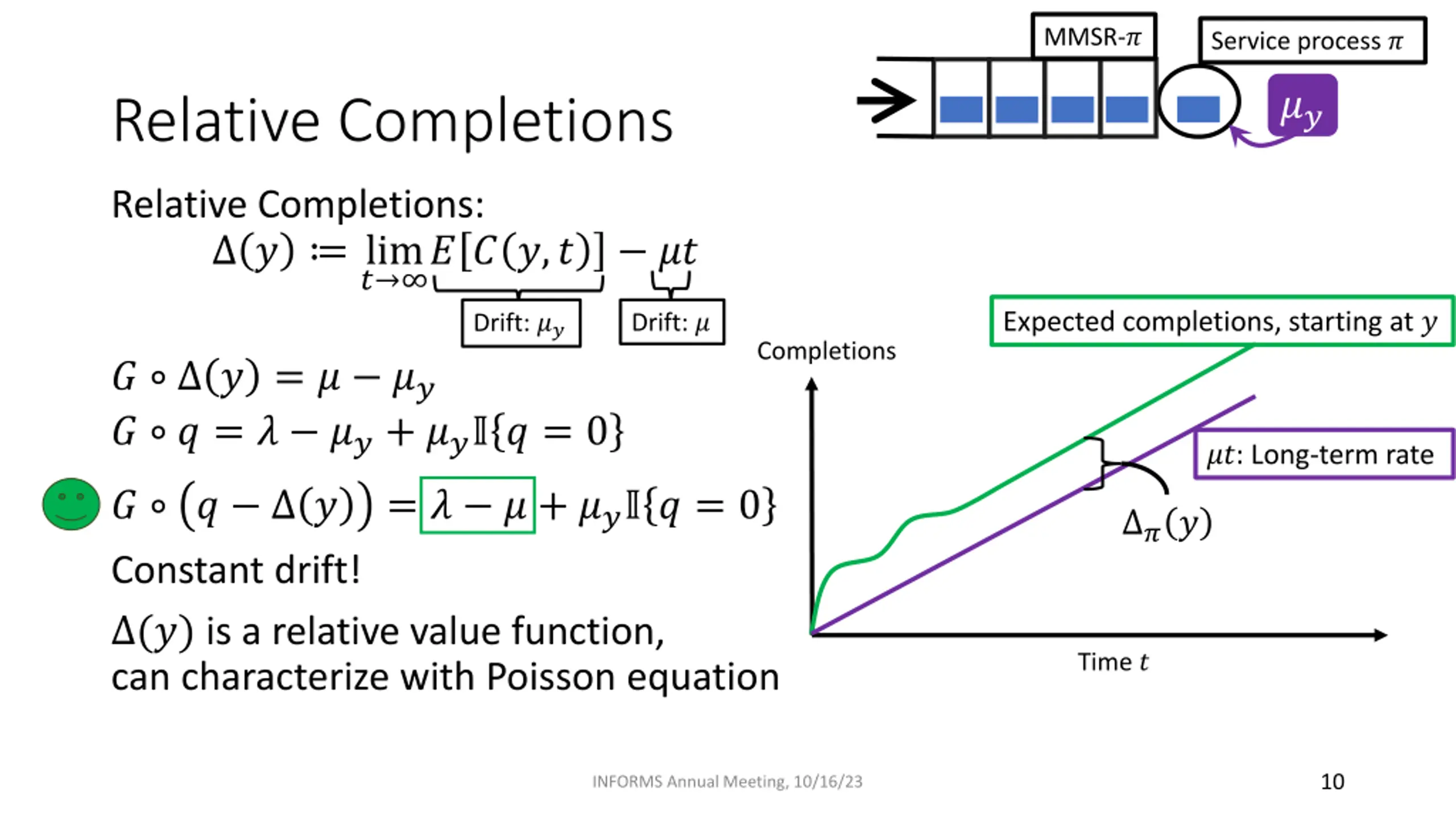MMSR-? Service process ? ?? Relative Completions Relative Completions: ? lim ? ? ? ?,? ?? Expected completions, starting at ? Drift: ? Drift: ?? Completions ? ? = ? ?? ? ? = ? ??+ ??? ? = 0 ??: Long-term rate ? ? ? = ? ? + ??? ? = 0 ?? Constant drift! (?) is a relative value function, can characterize with Poisson equation Time ? 10 INFORMS Annual Meeting, 10/16/23