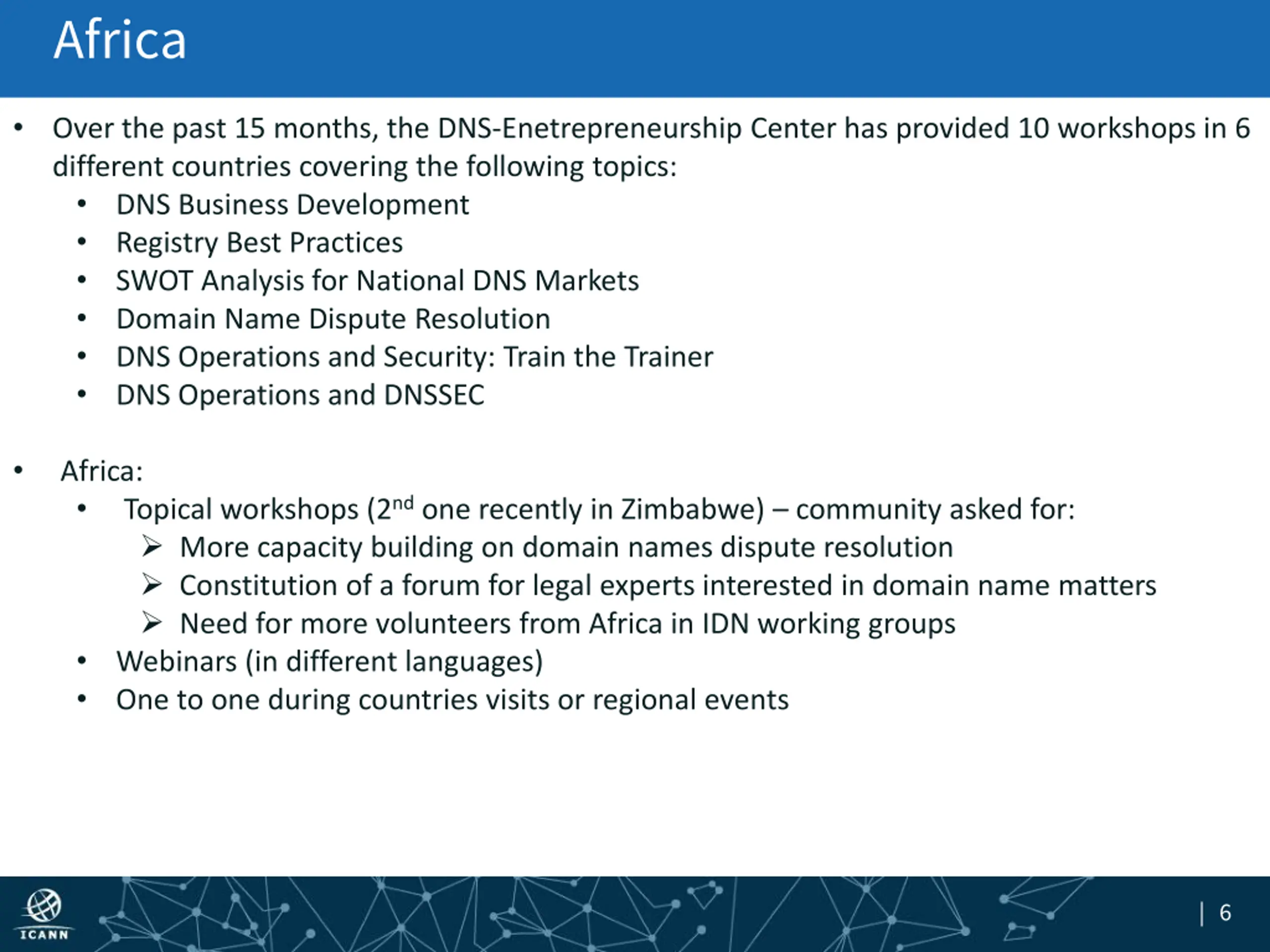 Africa Over the past 15 months, the DNS-Enetrepreneurship Center has provided 10 workshops in 6 different countries covering the following topics: DNS Business Development Registry Best Practices SWOT Analysis for National DNS Markets Domain Name Dispute Resolution DNS Operations and Security: Train the Trainer DNS Operations and DNSSEC Africa: Topical workshops (2nd one recently in Zimbabwe) community asked for: More capacity building on domain names dispute resolution Constitution of a forum for legal experts interested in domain name matters Need for more volunteers from Africa in IDN working groups Webinars (in different languages) One to one during countries visits or regional events | 6