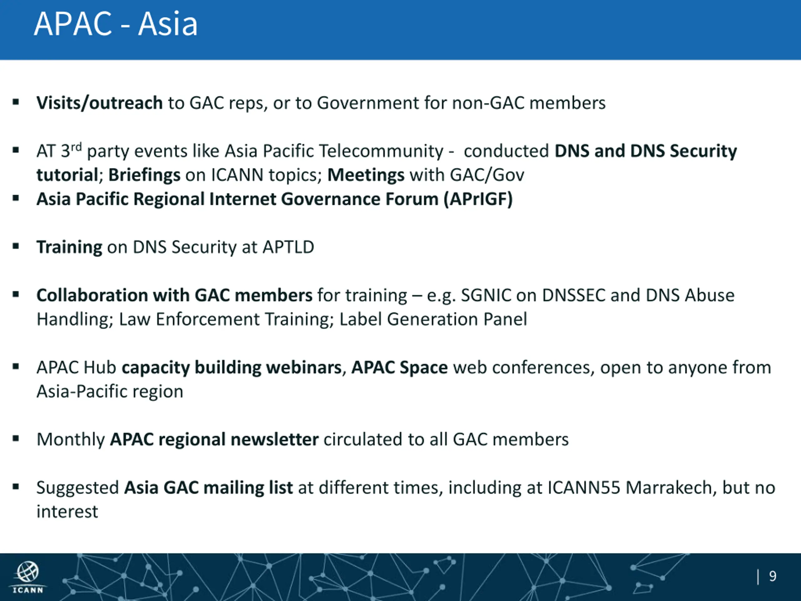 APAC - Asia Visits/outreach to GAC reps, or to Government for non-GAC members AT 3rd party events like Asia Pacific Telecommunity - conducted DNS and DNS Security tutorial; Briefings on ICANN topics; Meetings with GAC/Gov Asia Pacific Regional Internet Governance Forum (APrIGF) Training on DNS Security at APTLD Collaboration with GAC members for training e.g. SGNIC on DNSSEC and DNS Abuse Handling; Law Enforcement Training; Label Generation Panel APAC Hub capacity building webinars, APAC Space web conferences, open to anyone from Asia-Pacific region Monthly APAC regional newsletter circulated to all GAC members Suggested Asia GAC mailing list at different times, including at ICANN55 Marrakech, but no interest | 9