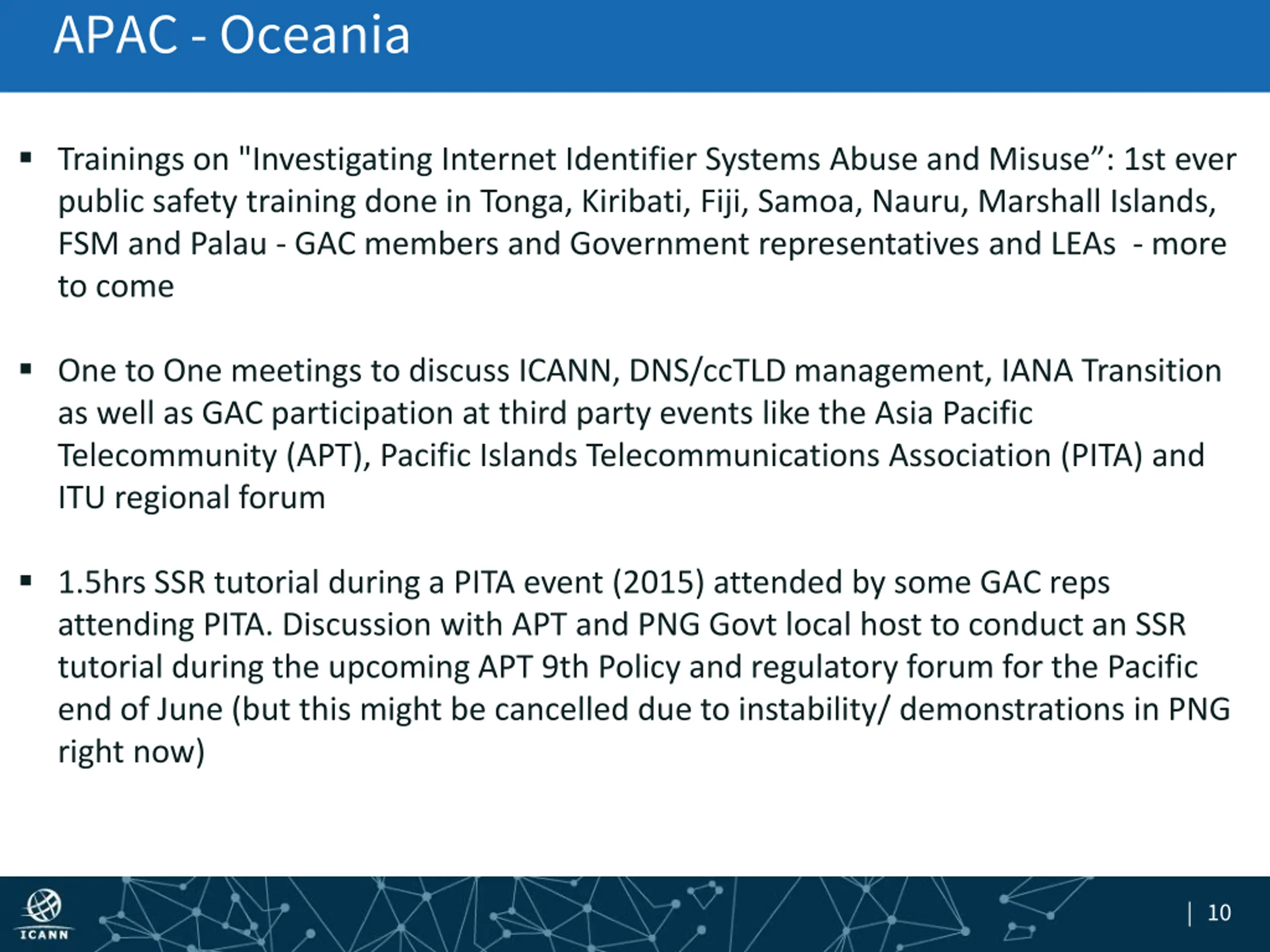 APAC - Oceania Trainings on "Investigating Internet Identifier Systems Abuse and Misuse : 1st ever public safety training done in Tonga, Kiribati, Fiji, Samoa, Nauru, Marshall Islands, FSM and Palau - GAC members and Government representatives and LEAs - more to come One to One meetings to discuss ICANN, DNS/ccTLD management, IANA Transition as well as GAC participation at third party events like the Asia Pacific Telecommunity (APT), Pacific Islands Telecommunications Association (PITA) and ITU regional forum 1.5hrs SSR tutorial during a PITA event (2015) attended by some GAC reps attending PITA. Discussion with APT and PNG Govt local host to conduct an SSR tutorial during the upcoming APT 9th Policy and regulatory forum for the Pacific end of June (but this might be cancelled due to instability/ demonstrations in PNG right now) | 10