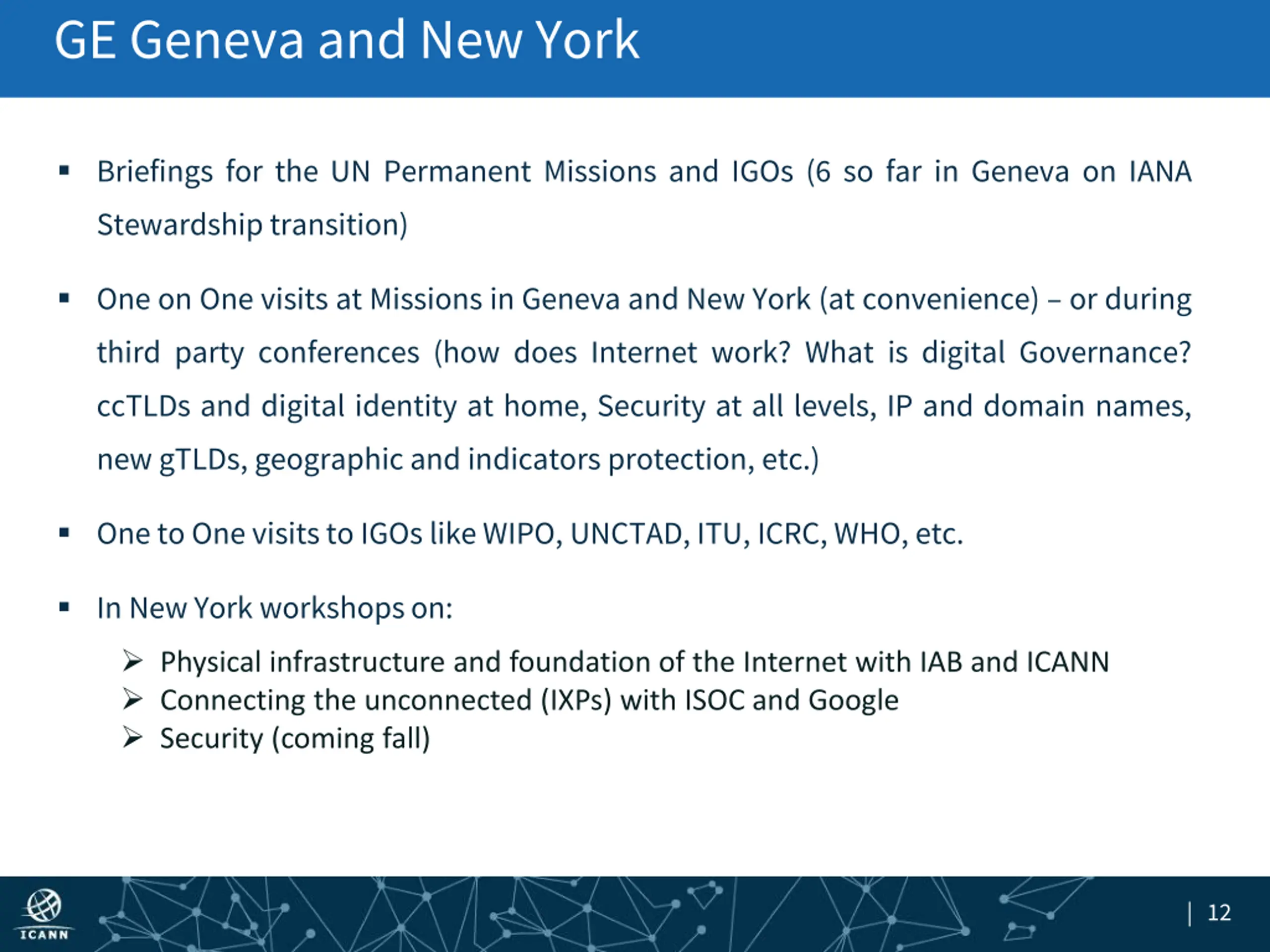 GE Geneva and New York Briefings for the UN Permanent Missions and IGOs (6 so far in Geneva on IANA Stewardship transition) One on One visits at Missions in Geneva and New York (at convenience) or during third party conferences (how does Internet work? What is digital Governance? ccTLDs and digital identity at home, Security at all levels, IP and domain names, new gTLDs, geographic and indicators protection, etc.) One to One visits to IGOs like WIPO, UNCTAD, ITU, ICRC, WHO, etc. In New York workshops on: Physical infrastructure and foundation of the Internet with IAB and ICANN Connecting the unconnected (IXPs) with ISOC and Google Security (coming fall) | 12