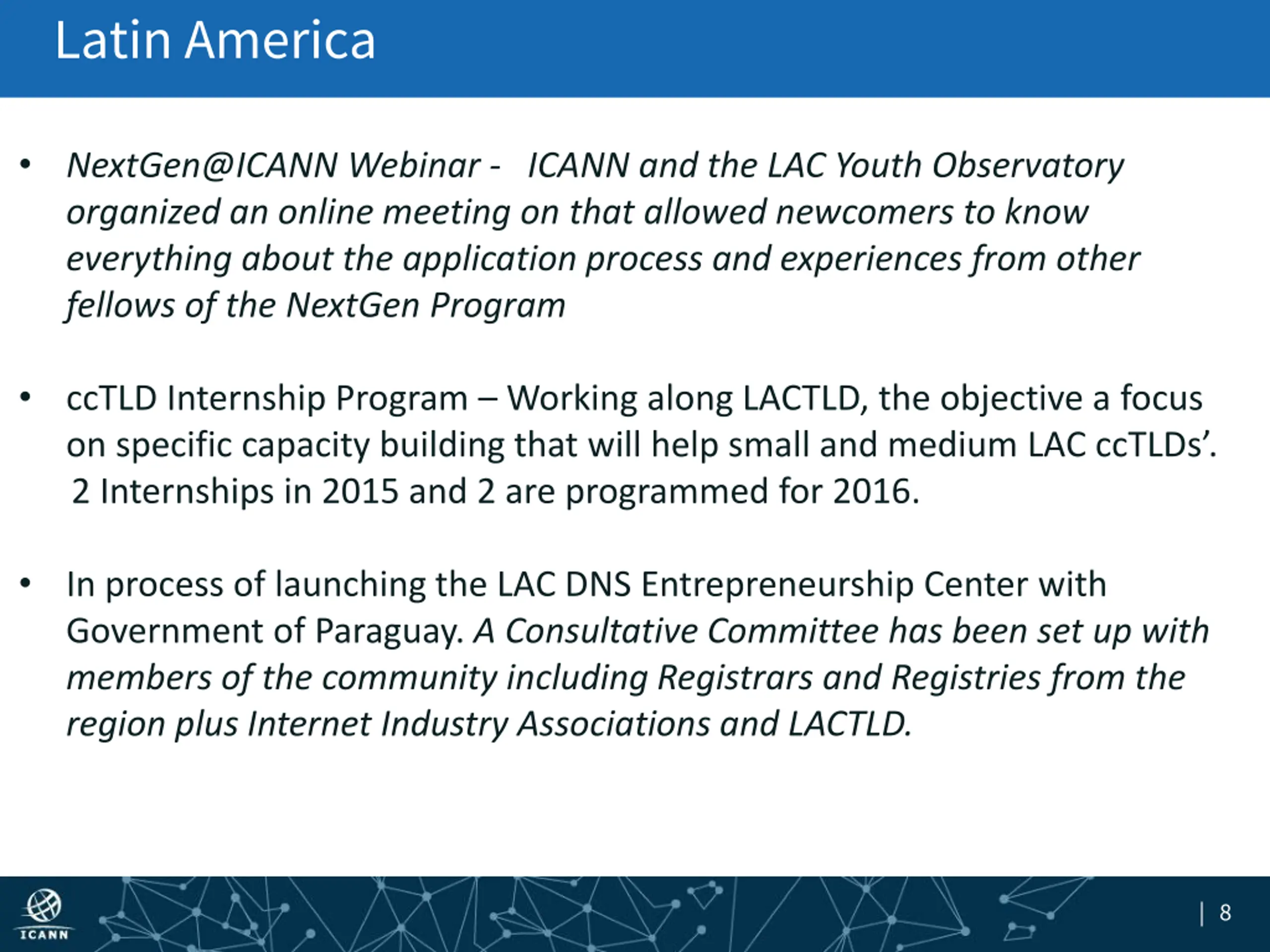 Latin America NextGen@ICANN Webinar - ICANN and the LAC Youth Observatory organized an online meeting on that allowed newcomers to know everything about the application process and experiences from other fellows of the NextGen Program ccTLD Internship Program Working along LACTLD, the objective a focus on specific capacity building that will help small and medium LAC ccTLDs . 2 Internships in 2015 and 2 are programmed for 2016. In process of launching the LAC DNS Entrepreneurship Center with Government of Paraguay. A Consultative Committee has been set up with members of the community including Registrars and Registries from the region plus Internet Industry Associations and LACTLD. | 8